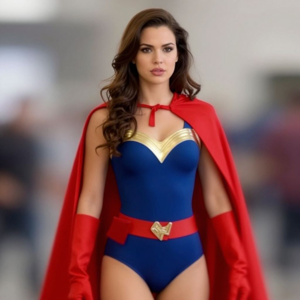 Photograph of a brunette woman in a blue Wonder Woman costume with gold chest plate, red cape, and gloves, standing confidently against a blurred indoor background