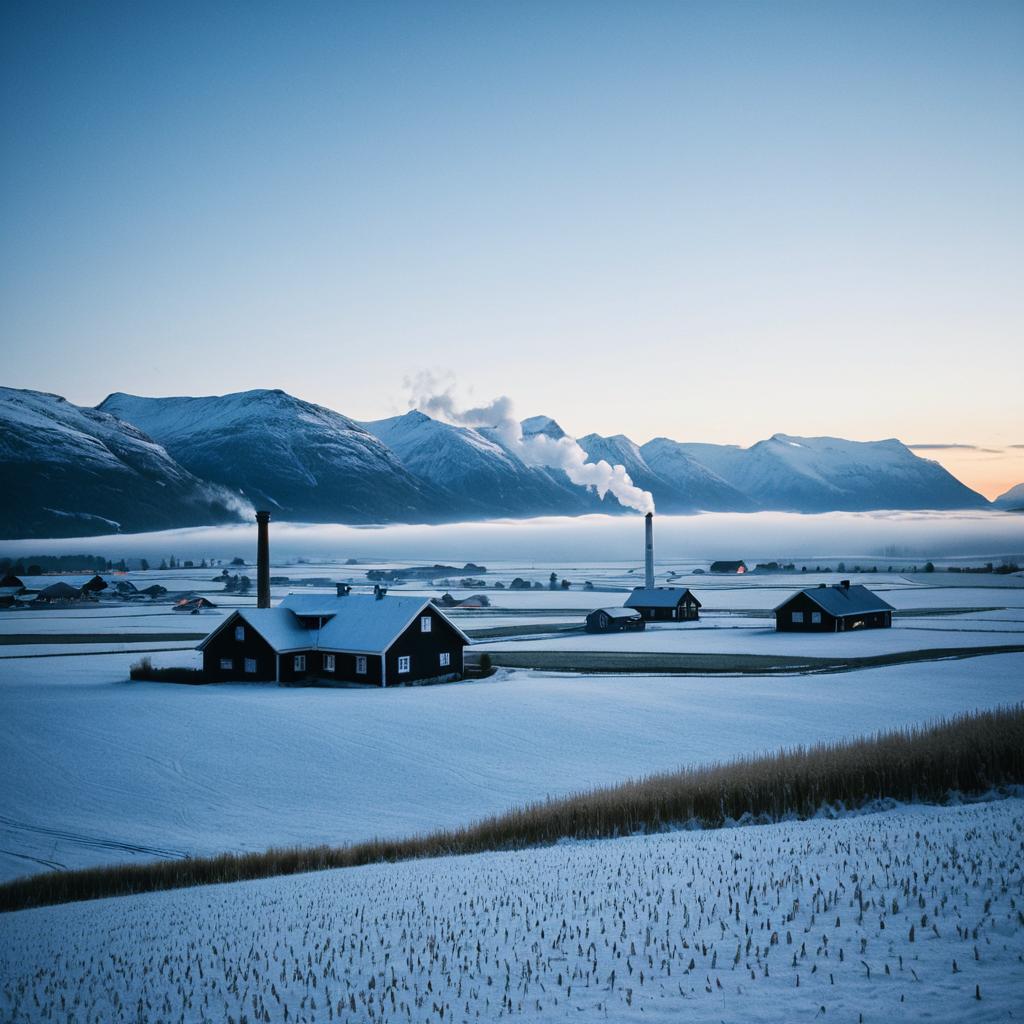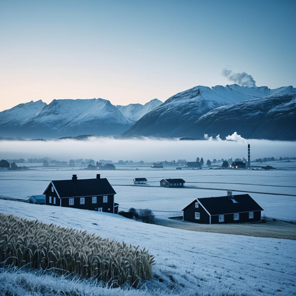 Photorealistic image of a dreamlike Norwegian landscape at dawn featuring snow-covered fields of wheat and scattered black wooden houses with white trim. Cool blue tones dominate the scene with majestic snowy mountains in the background. Light smoke rises from a chimney in the distance, with a hazy, glowing sky overhead.