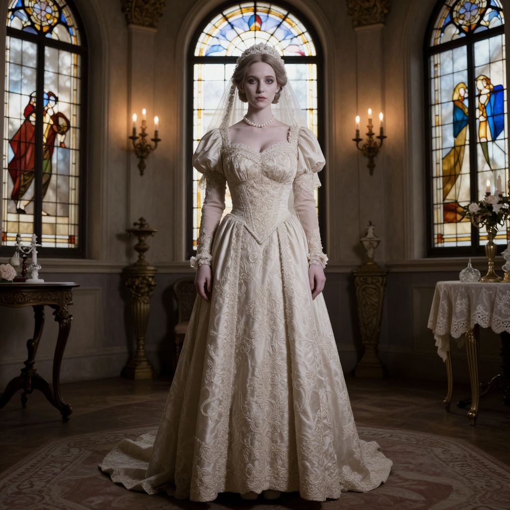Photograph of a solemn-faced woman standing in an ornate, dimly-lit room with large, stained glass windows. She wears an elaborate, ivory-colored, Victorian-style wedding gown with puffed sleeves and intricate lace embroidery, and a white veil. She has fair skin, blue eyes, and dark brown hair styled in an updo. The background features two wall-mounted candelabras with lit candles, and a small table with a lace-covered top on the right. The stained glass windows depict religious figures in vibrant colors. The room has dark wood paneling and a patterned rug on the floor.