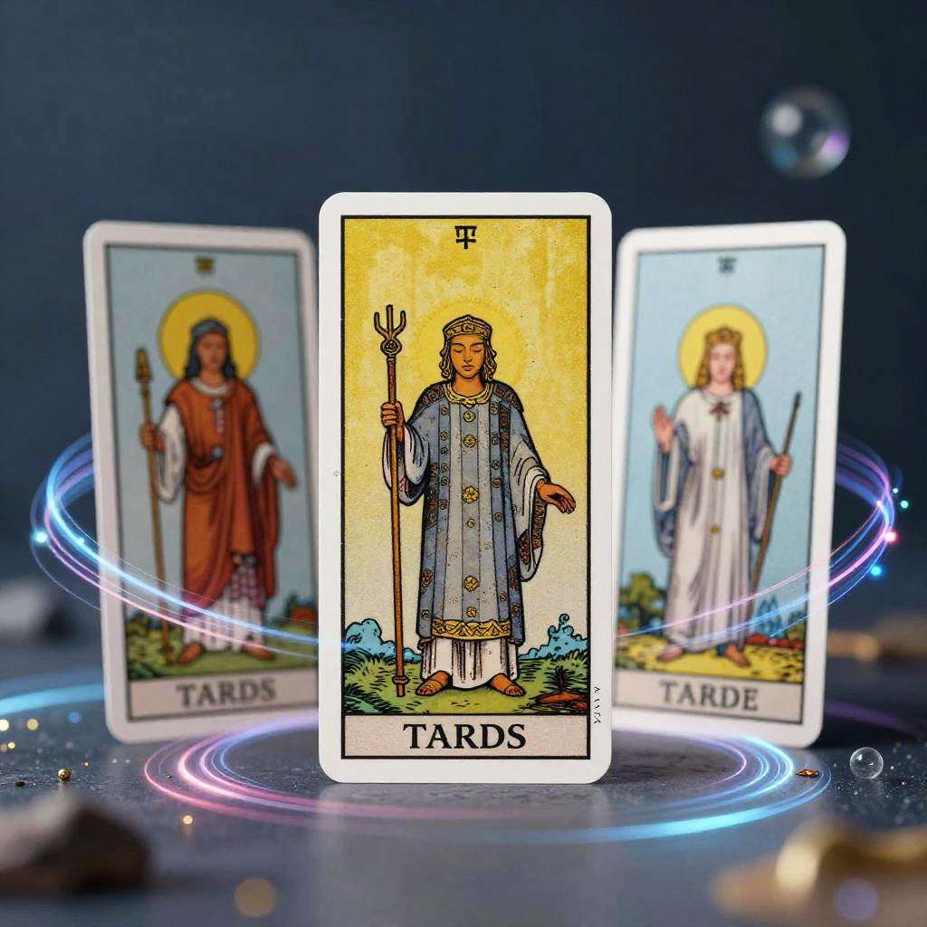Photograph of three Tarot cards with biblical figures; central card features a trident-wielding figure against a yellow background, flanked by figures holding