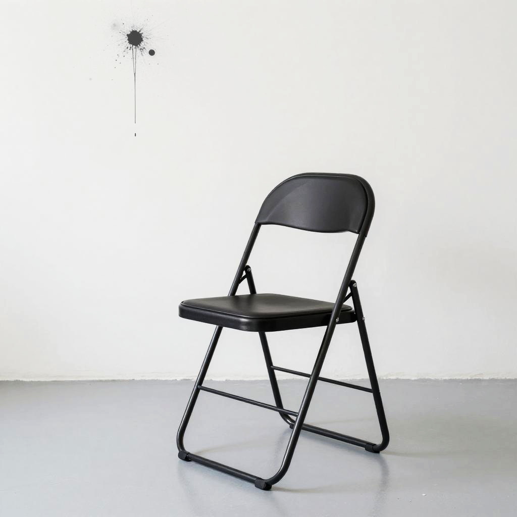 A minimalist photograph features a single black folding chair on a pale gray floor, positioned slightly to the right. The background is a stark, white wall with abstract black and gray splatters, creating a contrast. The chair's simple design and the chaotic splatters on the wall give the image a modern, almost surreal feel.