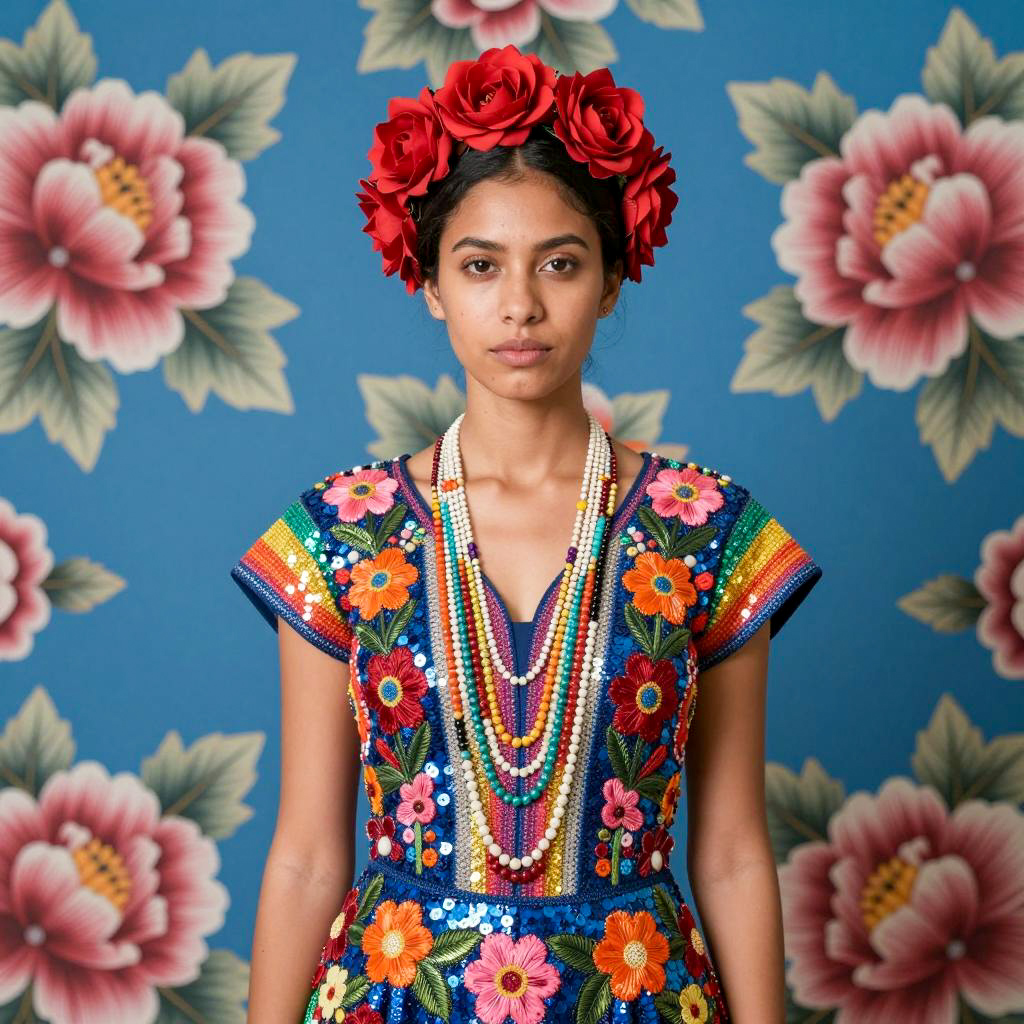 Photograph of a woman with light brown skin, dark hair, and red flower headdress. She wears a colorful, intricate, sequined dress with rainbow sleeves and blue, pink, and orange floral embroidery. Bright blue background with large, vivid floral patterns. Her expression is neutral. She stands centered, looking directly at the camera. The dress has long, beaded necklaces hanging down her chest.