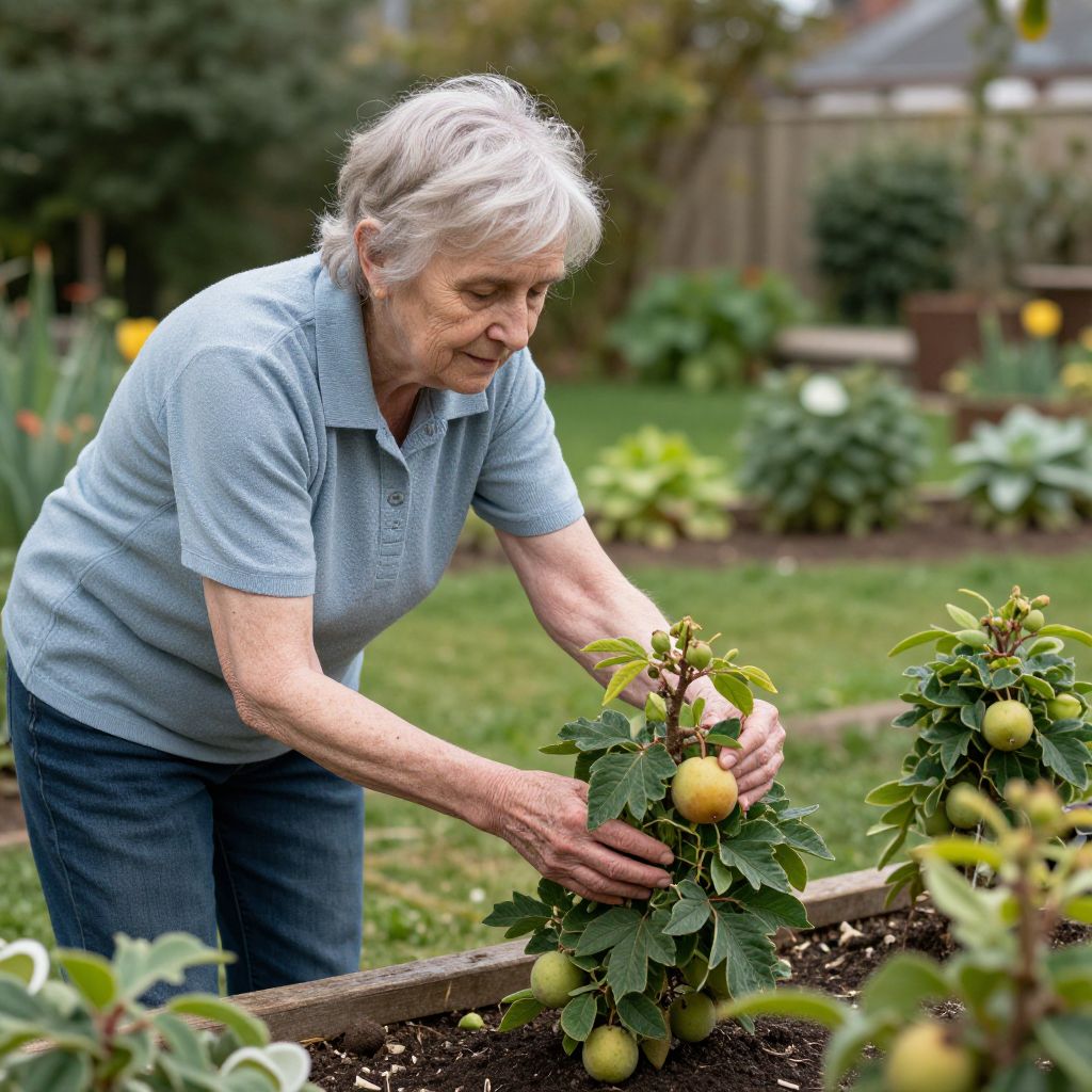 Photograph of an elderly woman with white hair, wearing a light blue polo shirt and jeans, picking yellow pears in a lush garden. Background includes