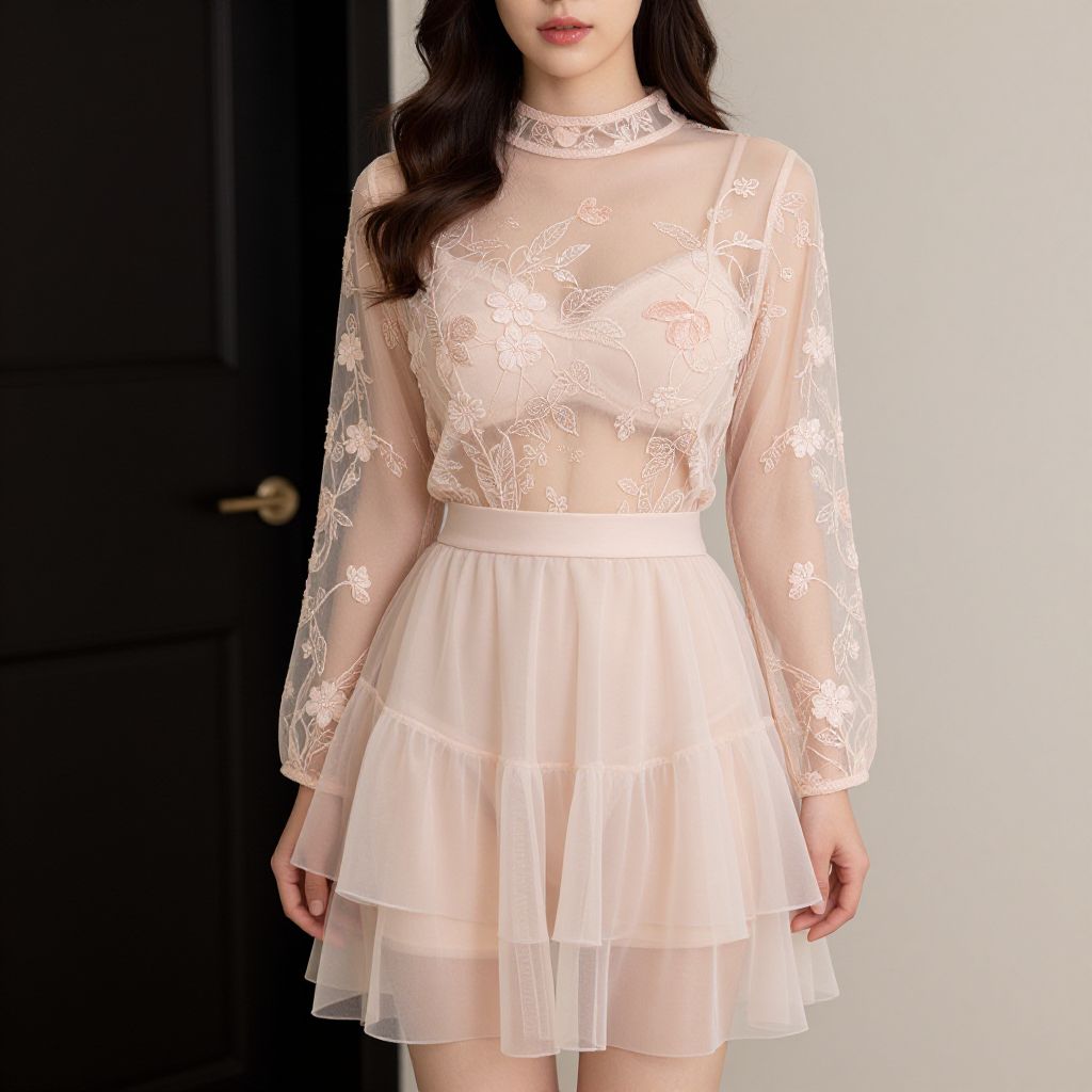 "Sheer mesh blouse, delicate floral embroidery, soft pastel pink, long sleeves, high neckline, matching sheer mesh skirt, layered ruffles, knee-length, lightweight fabric, elegant and romantic.. Sexy. Pretty face and beаutiful eyes. Big breasts."