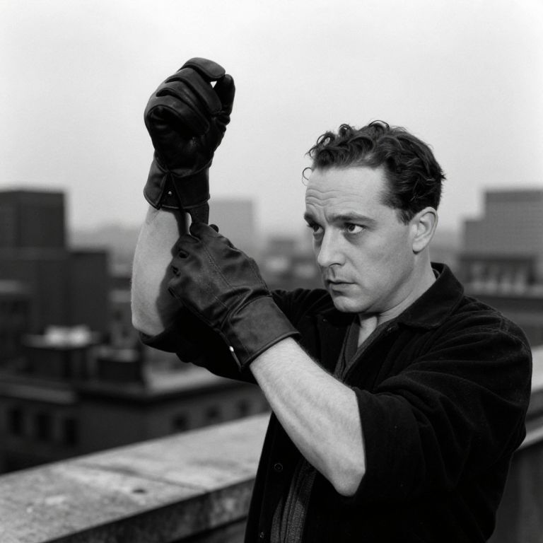 Harold Lloyd hand donning rooftop stunt gloves, moody cityscape backdrop, grainy film effect, high contrast black and white, intense action moment, vintage 1920s aesthetic