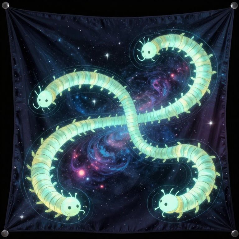 Glowing bookworms tunnel through the fabric of a cosmic tapestry, weaving new stories that ripple into alternate realities.