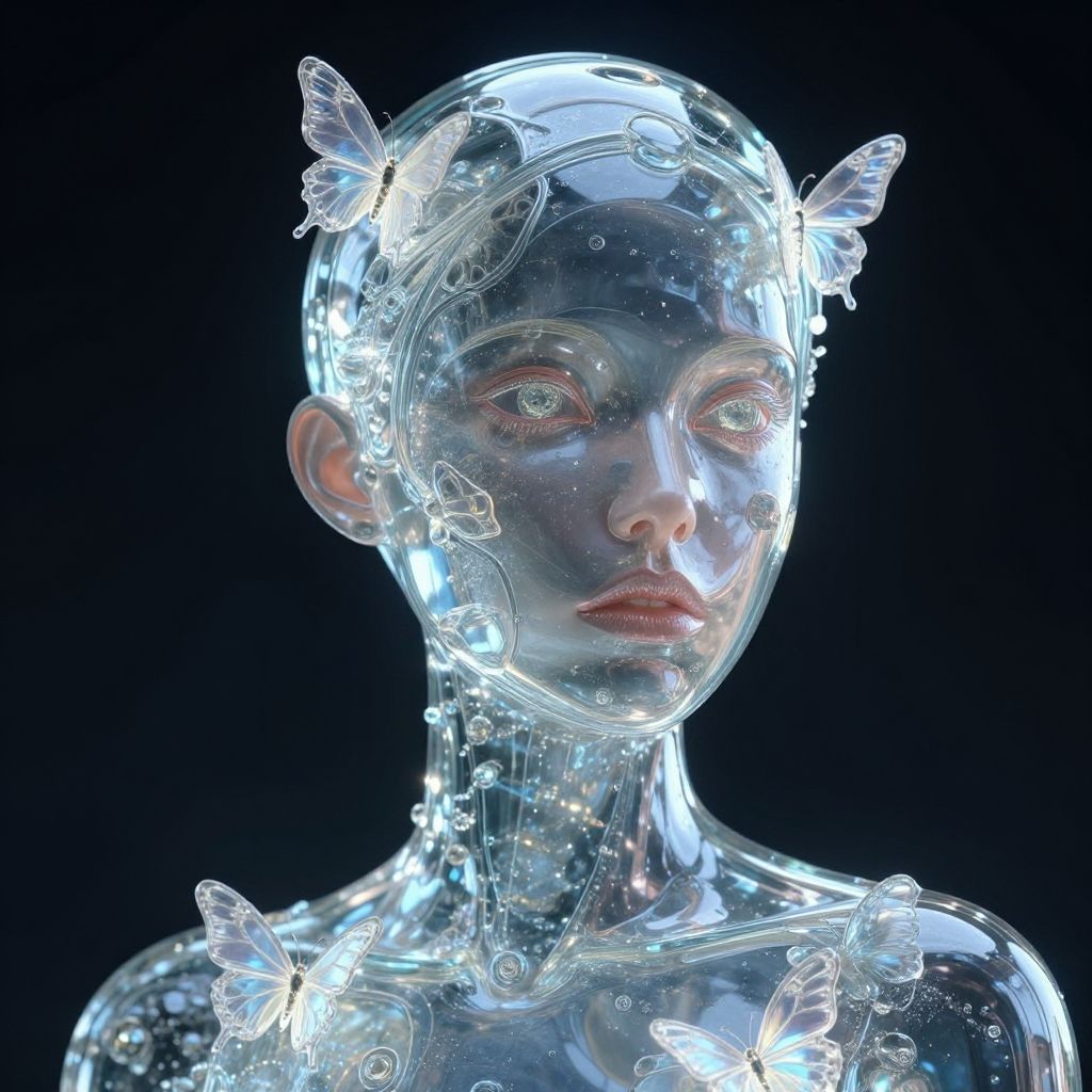 This is a digital CGI image of a transparent, glass-like female figure with a humanoid shape, set against a black background. The figure has delicate, butterfly-like patterns integrated into her hair, neck, and shoulders, glowing with a soft, ethereal light. Her facial features are subtle, with a calm expression, and her red lips contrast with the clear, glass-like texture. Her eyes are partially reflective, adding a sense of depth. The transparent material of her body reveals intricate, swirling patterns, giving a surreal, almost dreamlike quality to the image. The overall aesthetic is futuristic and otherworldly.