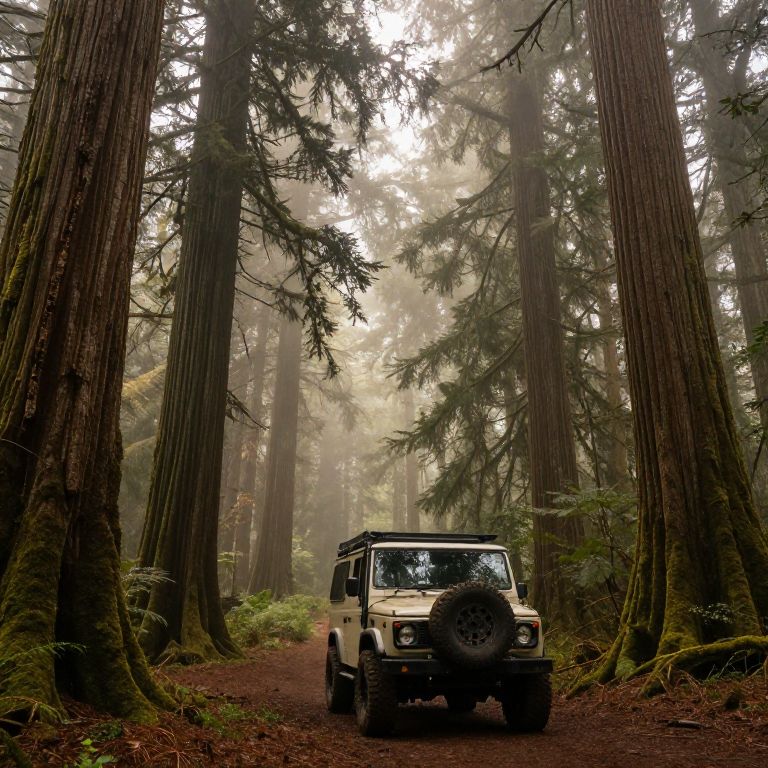 Photograph of a white off-road Jeep with a spare tire on the front, parked on a forest trail surrounded by tall, misty redwood trees