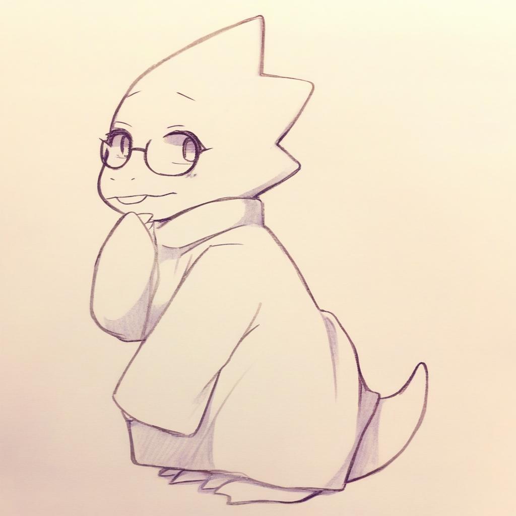 Monochrome hand-drawn sketch of Alphys, a character from Undertale, depicted as a reptilian anthropomorphic figure wearing glasses and a lab coat. The drawing features her distinctive spiked head, tail, and claws, showcasing a gentle and thoughtful expression.