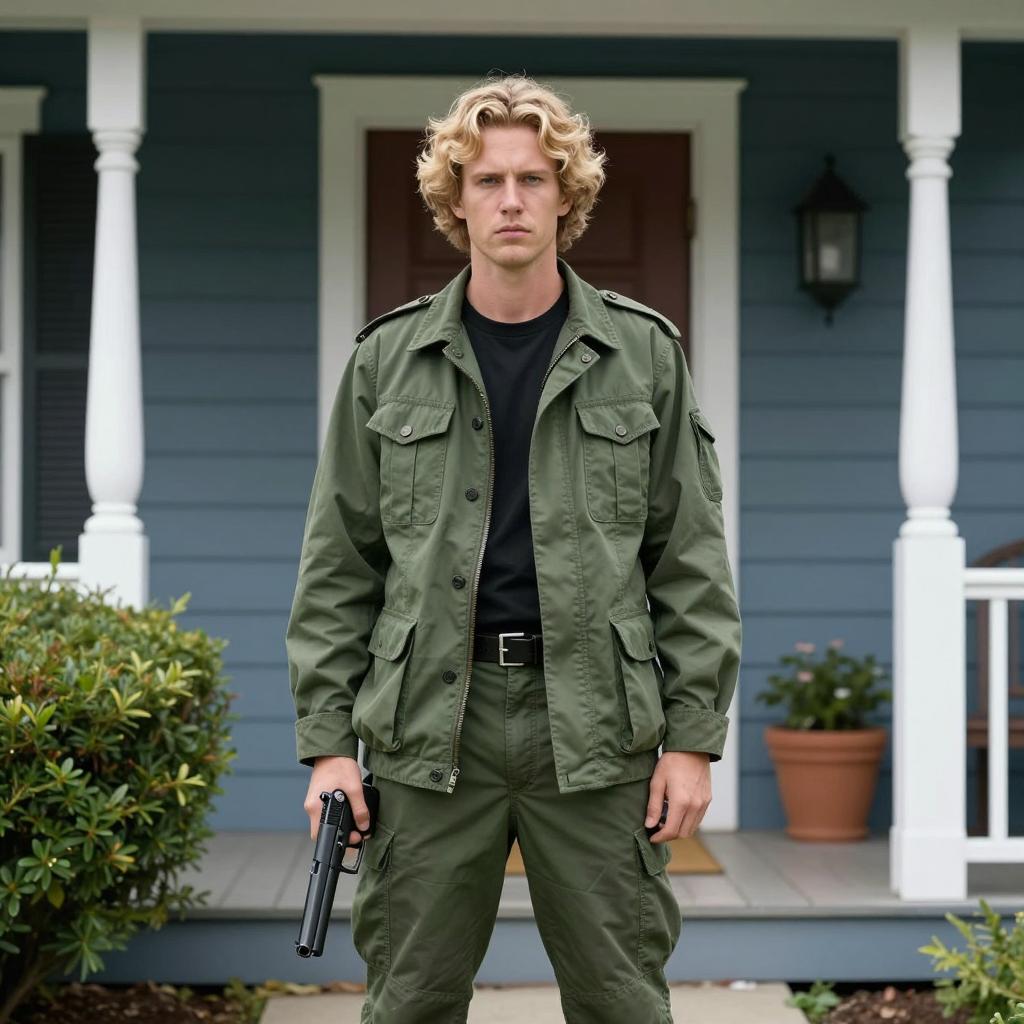 Photograph of a young man with short, red hair, standing beside a red vintage truck. He wears a white shirt with black suspenders and a patterned scarf, holding a black gun. Background: blurred city street with people and cars. Intense expression. Blurred people in background.
