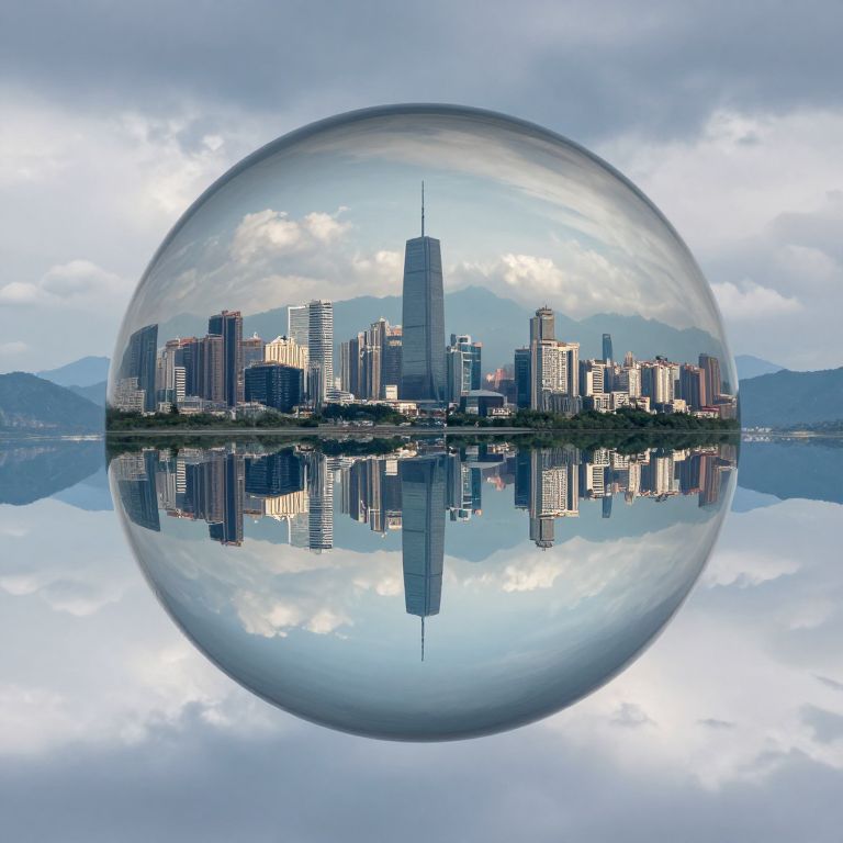 A giant, transparent glass sphere cradles an inverted cityscape, its dense urban sprawl mirrored perfectly in the water below, while a serene, otherworldly landscape of distant mountains and clouds floats above, defying gravity and reality alike.