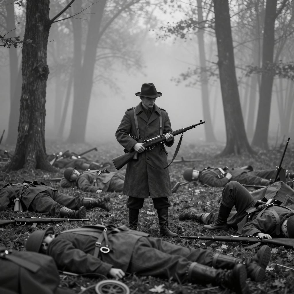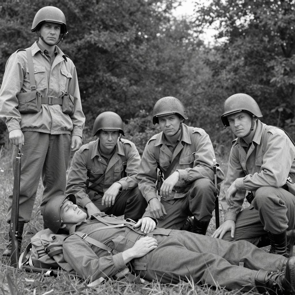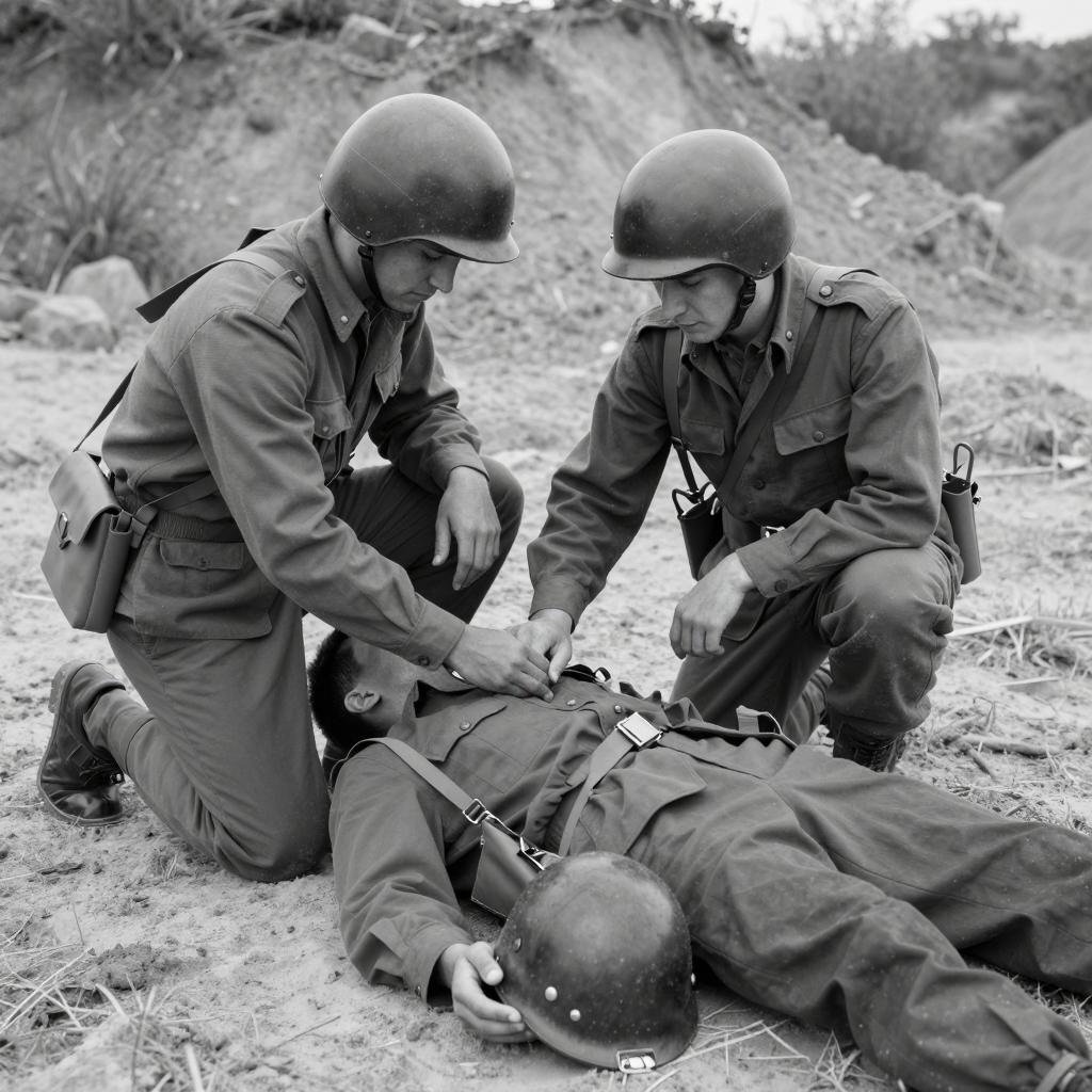 Black and white photograph of two soldiers in helmets. One soldier kneels beside a fallen soldier, holding their hand. The fallen soldier's helmet stands upright on the ground. Both wear uniforms with visible buttons and pockets. Background shows a sandy, uneven terrain with sparse vegetation. The kneeling soldier has a focused expression. The fallen soldier's face is partially obscured. The image has a documentary style.