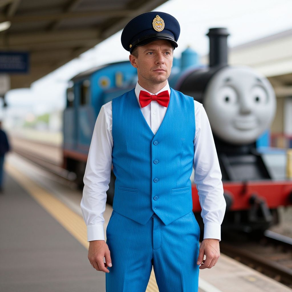 A man dressed in a detailed Thomas the Train cosplay stands waist-up at a train station platform. He wears a blue pinstriped vest and matching trousers, a red bow tie, and a conductor's hat, perfectly capturing the character's classic look in a realistic style.