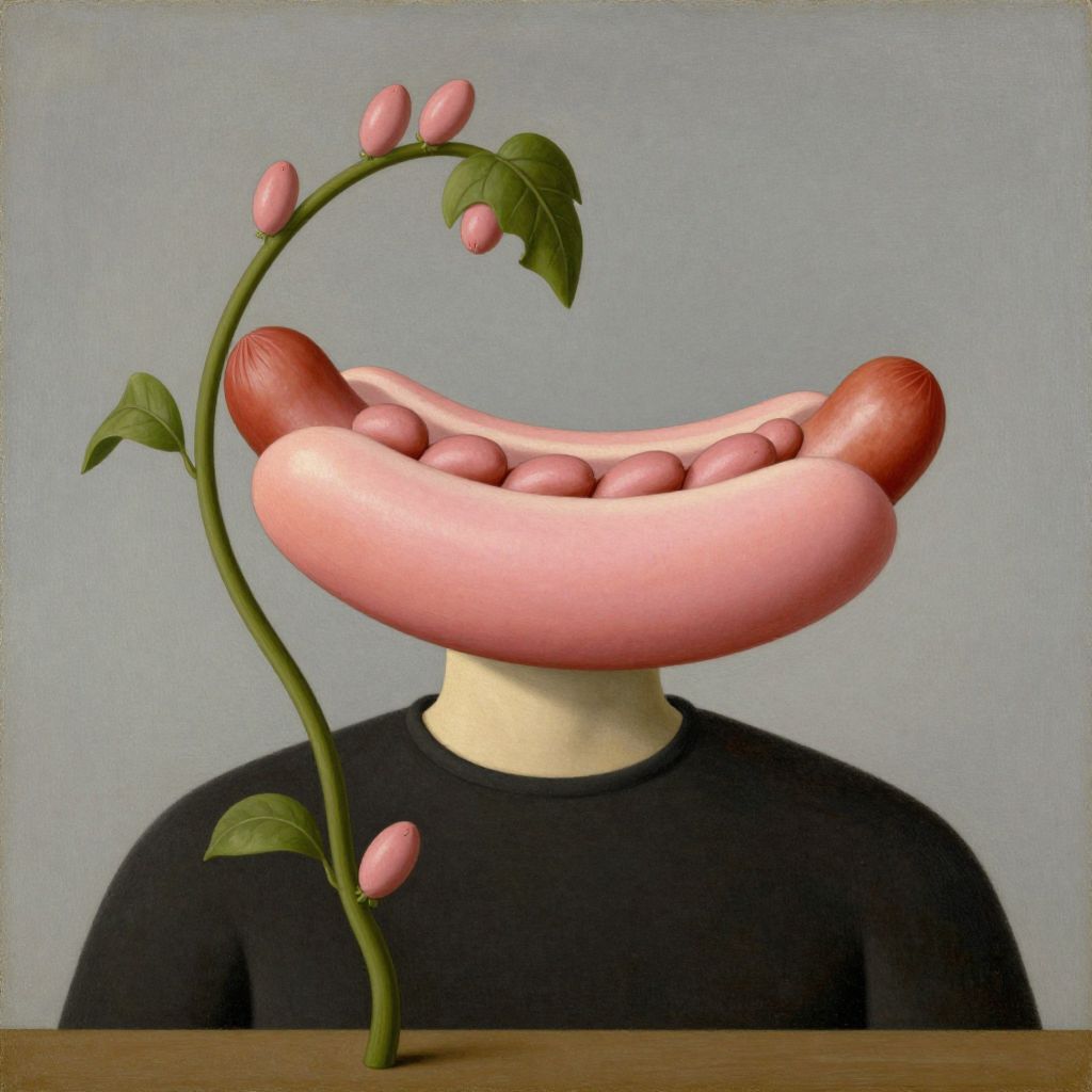 Rene magritte's son of man painting with a floating pink hotdog blocking the face, the hotdog has a stem and leaves and is growing more unripe hotdogs on the hotdog vine
