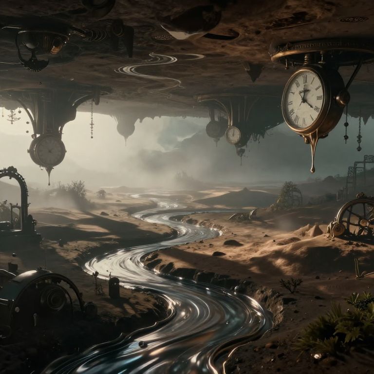 A dreamlike landscape depicting an inverted perspective from beneath the earth's surface, where surreal elements intertwine with mechanical structures. Flowing streams of liquid metal mimic the appearance of melting clocks, meandering across a misty terrain and casting dramatic shadows that evoke both curiosity and discomfort. The scene captures a mysterious atmosphere, as natural and mechanical components blend seamlessly, inviting viewers to delve into the depths of their subconscious minds through this thought-provoking visual exploration.