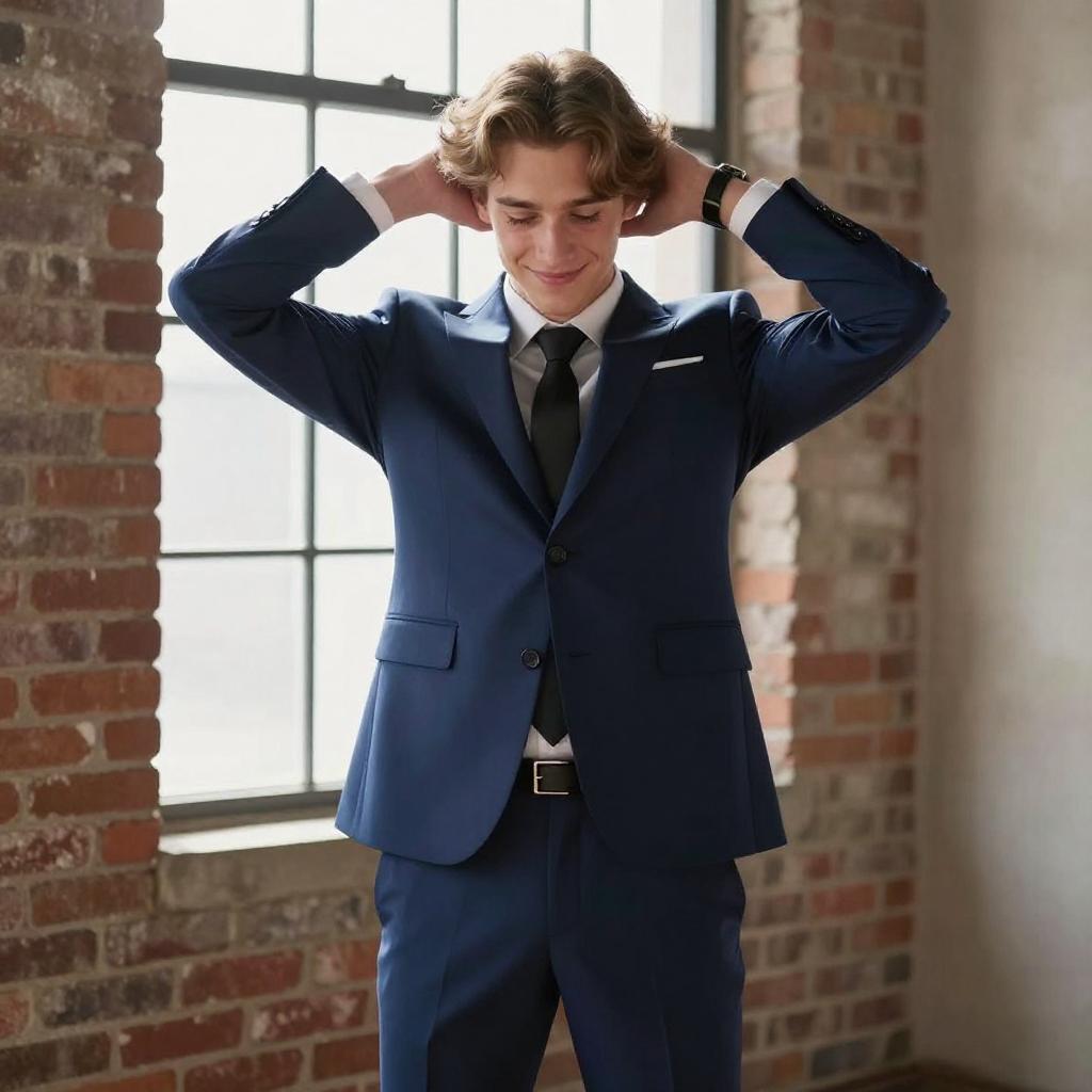 Photograph of a young man with light brown, wavy hair standing in a sunlit, brick-walled room. He's wearing a sharp, dark blue suit with a white shirt and black tie, and he's smiling while adjusting his hair with both hands behind his head. The natural light from the large windows behind him highlights the textures of the brick and his polished attire.