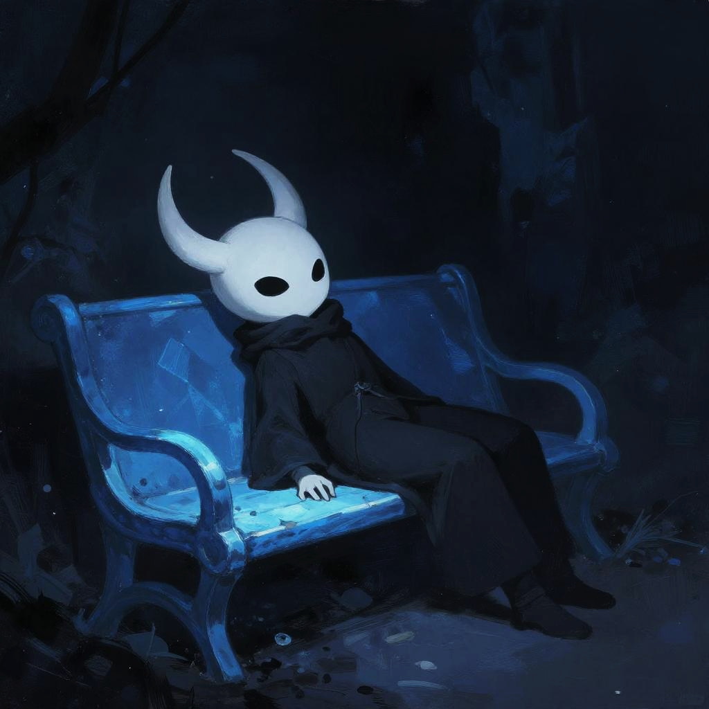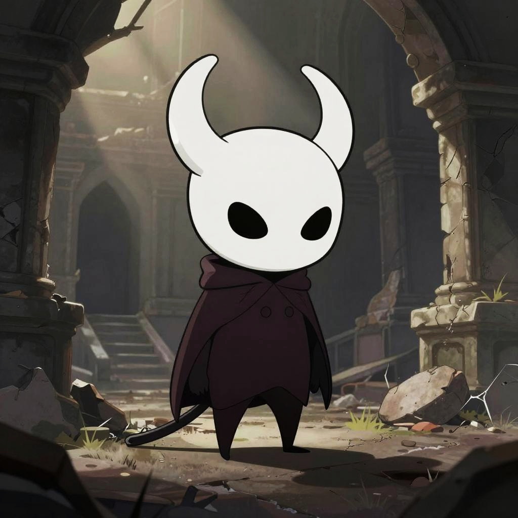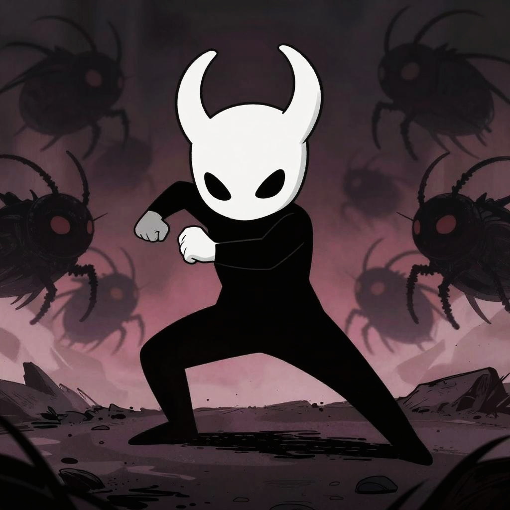 Main character of Hollow Knight poised in an intense battle stance against shadowy insectoid enemies, dramatic contrast lighting, dynamic composition, hand-drawn art style