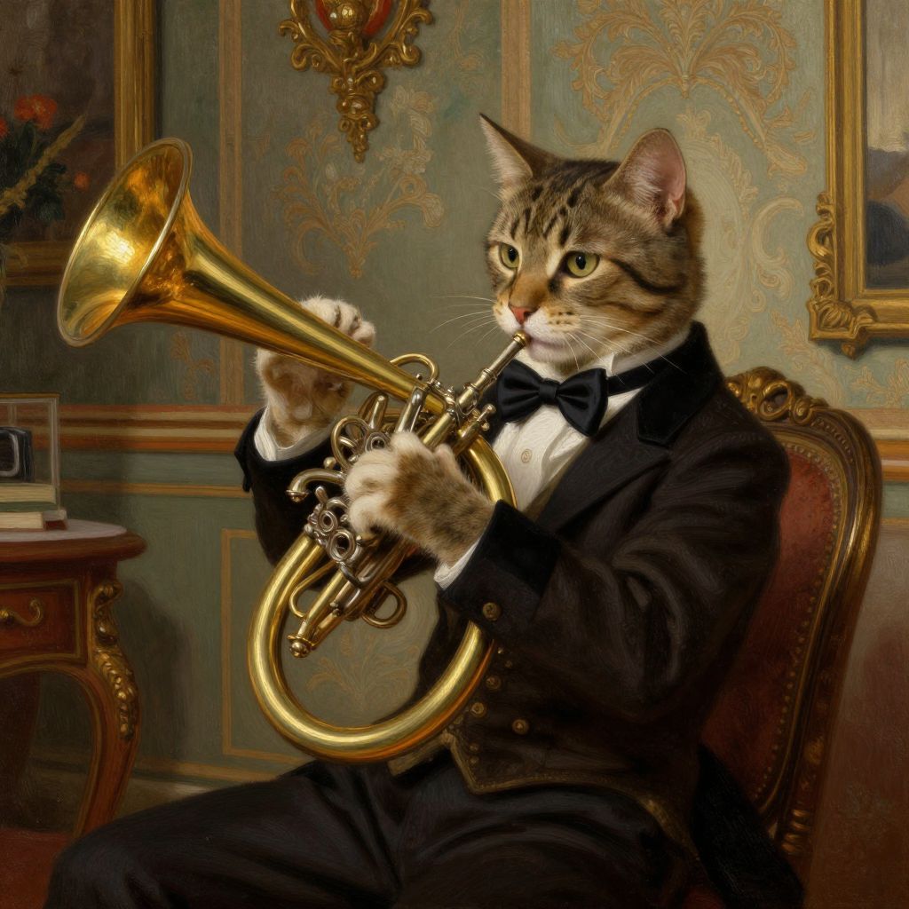 Cat playing French horn in an elegant Victorian parlor, ornate wallpaper and antique furniture, soft ambient lighting, intricate brass instrument details, the cat wearing a tiny bow tie, warm rich color palette, finely detailed oil painting style.