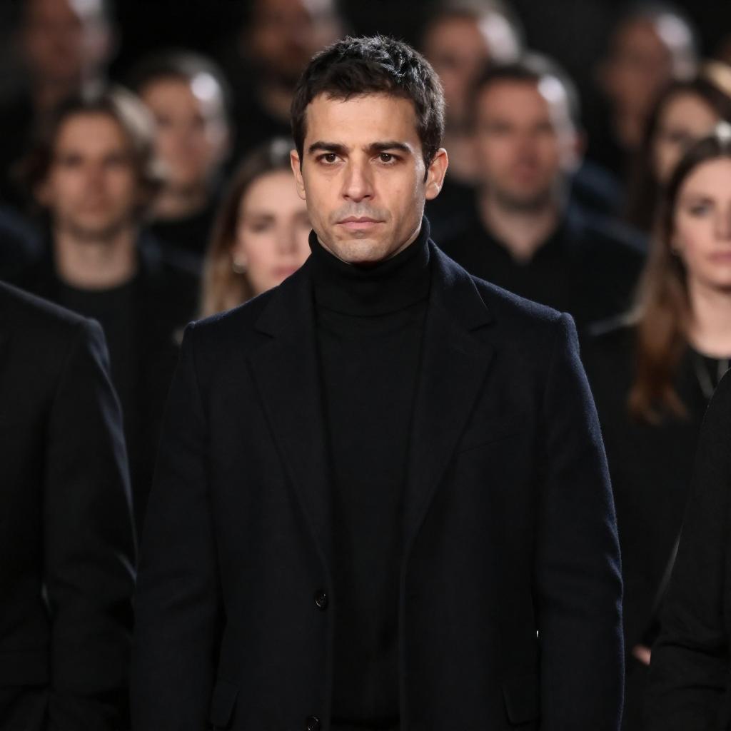 Photograph of a serious-looking man with short dark hair, wearing a black turtleneck and black coat, standing in front of a blurred crowd of people in dark clothing. The background is dimly lit, with the crowd's faces illuminated by soft light, creating a contrast with the man's focused expression.