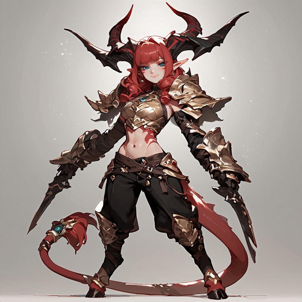 Digital artwork of a fierce, armored demon woman with red hair, black and red spiked armor, dual knives, and a tail, standing confidently against a