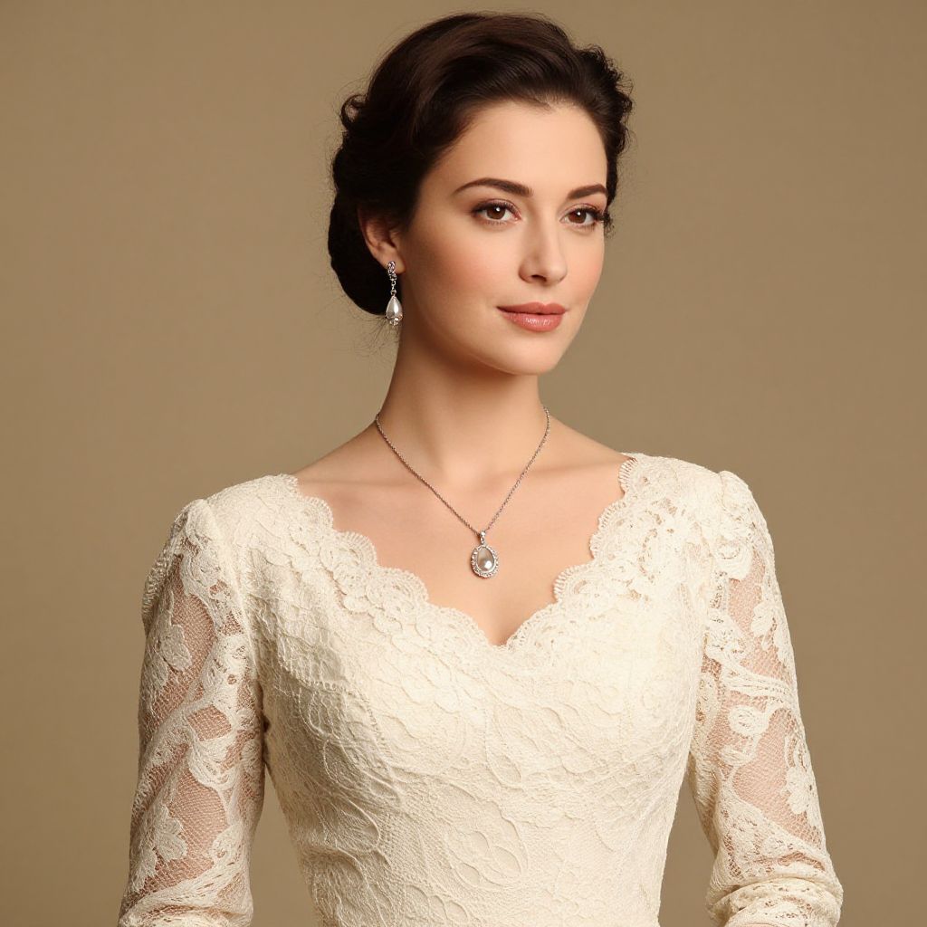 Photograph of a young woman with fair skin and dark brown hair styled in an elegant updo. She has brown eyes and a gentle smile. She is wearing a white lace wedding dress with long sleeves and a V-neckline, showcasing intricate floral lace patterns. She accessorizes with a silver necklace featuring a small pendant and matching teardrop-shaped earrings. The background is a solid, neutral beige, which contrasts with her dress. The lighting is soft, highlighting her serene expression and the delicate texture of her lace gown.