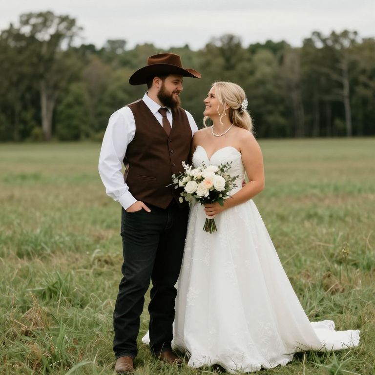 Photograph of a cute couple on a grassy field. The groom, with a brown cowboy hat, white shirt, brown vest, black jeans, and brown boots, has a beard and looks at his blonde bride. She wears a white strapless wedding dress with a floral bouquet, pearl necklace, and hair ornament. They're standing close, smiling, with a forest in the background under a cloudy sky.