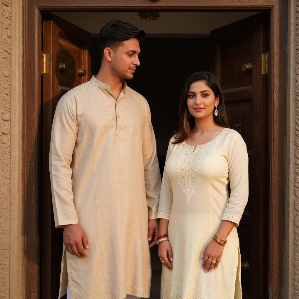 A lifestyle photograph of a young couple in a plain punjabi suit design, the man in a light beige kurta with a straight cut and the woman in a soft cream-colored kurta, standing under a traditional badi door in a heritage-style home in Lahore, with warm golden-hour lighting emphasizing fabric texture and regional details.. The woman has big tits and cute face