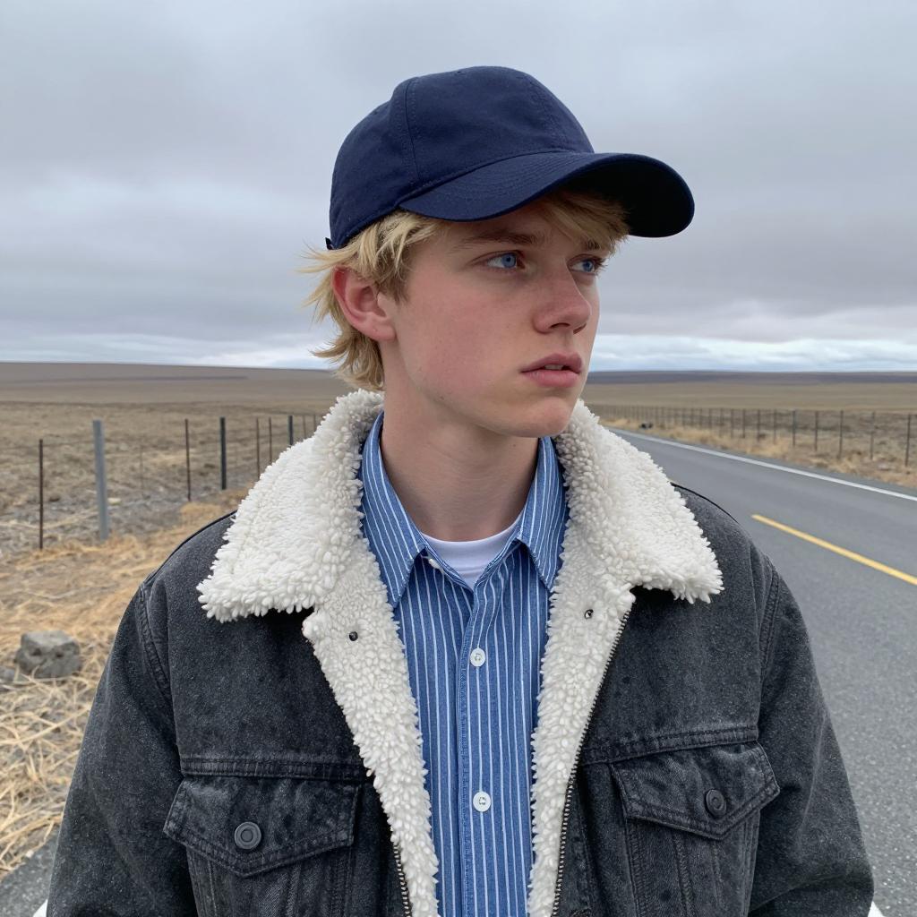 Young man with light skin, blond hair, and blue eyes, wearing a dark blue cap, blue striped shirt, and gray jacket with white fur collar, stands on a deserted rural road. He looks to the right with an intense expression. Background: flat, dry landscape with a wire fence. Overcast sky. Road with yellow lines.