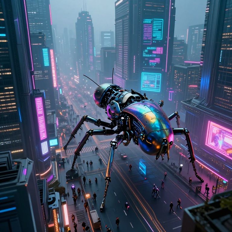 Imagine a futuristic cyberpunk cityscape viewed from an insect-like robotic perspective, towering skyscrapers adorned with vibrant neon lights and holographic displays that shimmer amidst the hazy atmosphere. The bustling streets below teem with humans and artificial beings navigating through a maze of technological wonders, offering both vast panoramas and intricate details like the iridescent sheen on metallic surfaces and the exposed circuitry within cybernetic enhancements. This dynamic scene captures the harsh neon-lit reality while evoking a sense of wonder and curiosity, inviting exploration from an entirely unique and captivating viewpoint.