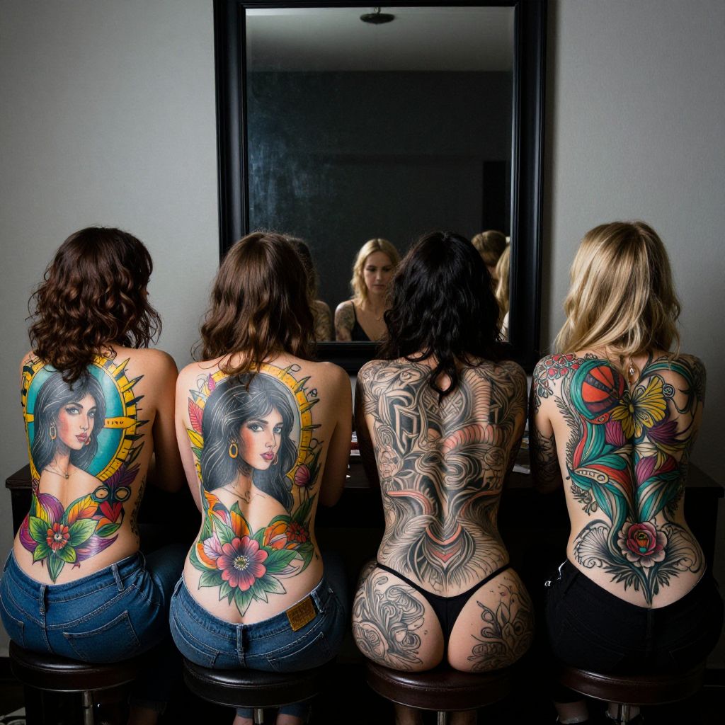 Photograph of five women standing in shallow, clear turquoise water at sunset, facing away from the camera. They wear colorful string bikinis; blue, purple, red, and red. Each woman has a distinct tattoo sleeve on their back. From left to right: blonde with wavy hair, medium build; blonde with straight hair, slim build; brunette with curly hair, medium build; dark-haired with straight hair, slim build; dark-haired with long hair, slim build. Background features lush green mangroves and a pink-orange sunset sky. Their tanned skin contrasts with the vibrant bikinis and tattoos. Water is calm, reflecting the colorful sky.