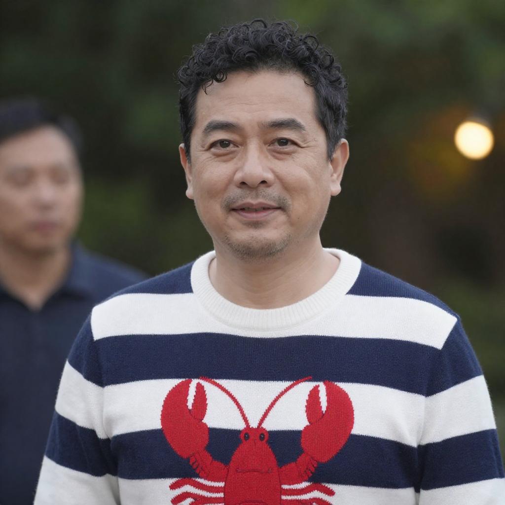 Photograph of a middle-aged man with short, curly black hair, light stubble, and a slight smile. He wears a white and blue striped sweater with a red lobster graphic. Background is blurred with greenery and lights. Another person, partially visible, stands to the left. Man's face is centered and slightly to the right.