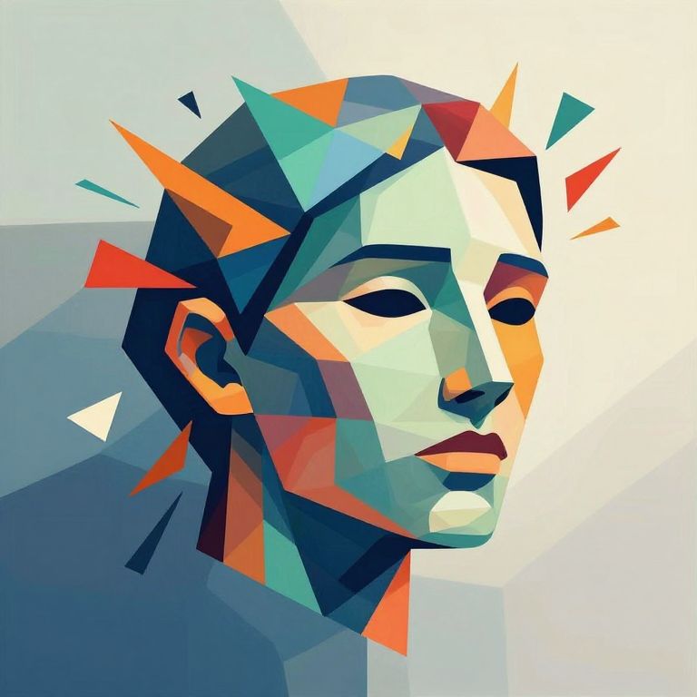 The image presents an abstract representation of a mind, with a face composed of fragmented, geometric shapes and vibrant colors. The face is divided into various sections, each filled with different hues and textures, creating a sense of complexity and depth. The shapes are primarily triangles and polygons, arranged in a chaotic yet structured manner, giving the impression of a mind in constant motion. The colors range from cool blues and greens to warm oranges and reds, adding a dynamic and energetic feel to the composition. The background is a gradient of light and dark shades, enhancing the three-dimensional effect and making the face appear to be floating or emerging from the depths. The overall composition is balanced yet dynamic, with the face positioned centrally and the geometric elements radiating outward, suggesting a sense of expansion and thought.