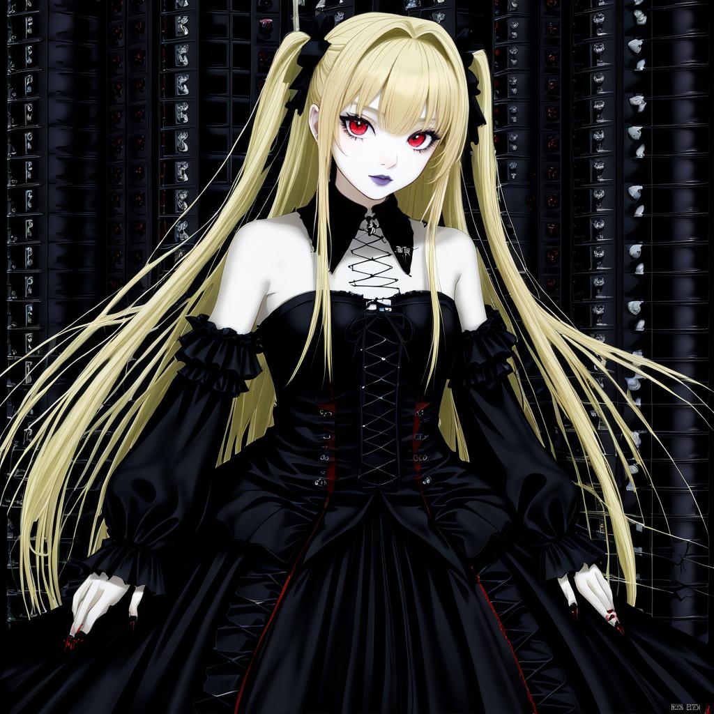 Amane misa, death note, 1girl, red eyes, blonde hair, long hair, two side up, medium breasts, black dress, bare shoulders, detached sleeves, nail polish, goth fashion, goth fashion, by artist nidy, anime