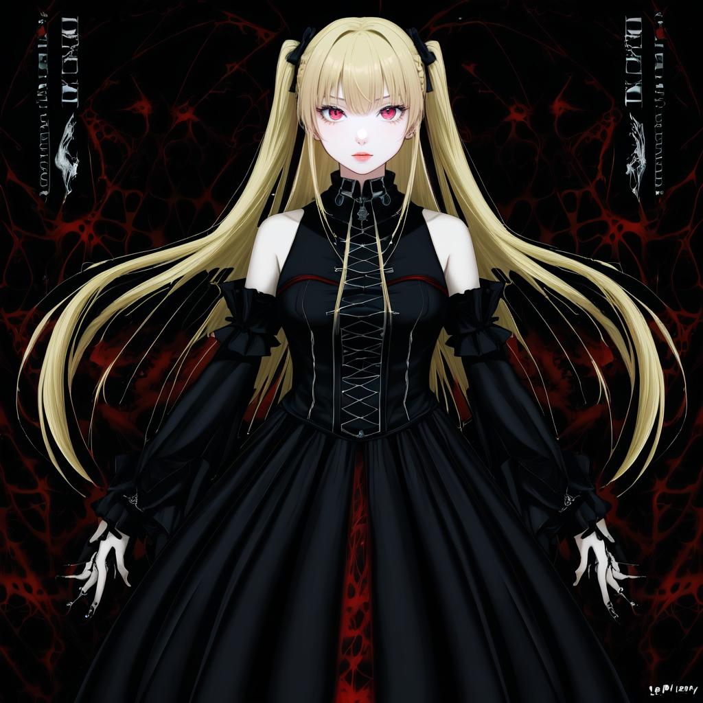 Anime-style illustration of a gothic female character with long blonde hair tied in two side ponytails with black bows. She has striking red eyes, pale skin, and wears a black gothic dress with red and silver lace details and detached sleeves. The character features medium breasts and bare shoulders, with dark nail polish and detailed makeup. The background shows dark window frames, enhancing the gothic atmosphere.