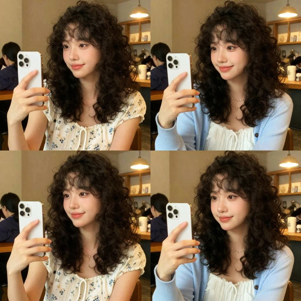 Photograph of a smiling young Asian woman with curly black hair, wearing a white floral dress and light blue cardigan, taking four identical selfies in a