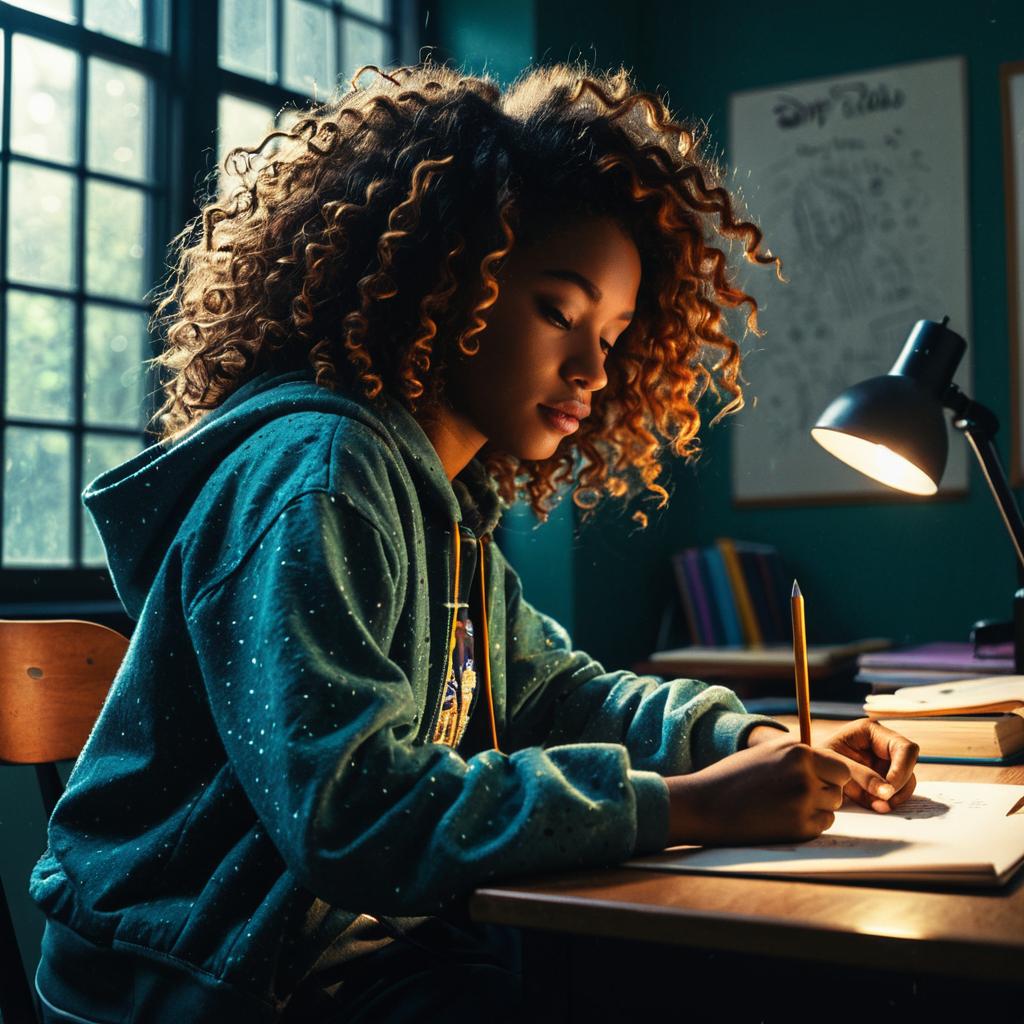 Portrait of a moody black teenage girl with glowing freckles and curly hair illuminated by rim lighting, sitting at a desk in a school setting, concentrating on writing in a notebook. The scene is softly backlit with warm, godly light creating an emotional and whimsical atmosphere.