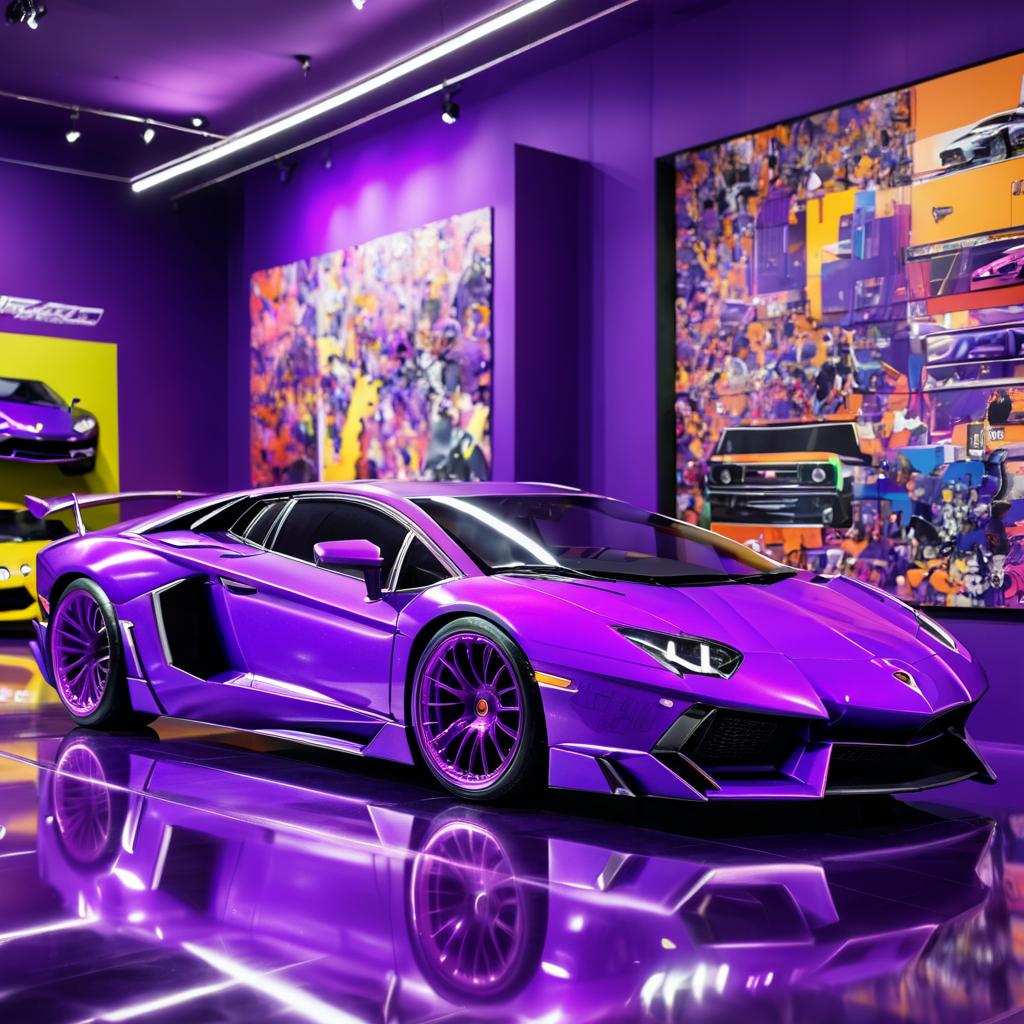 A sleek purple Lamborghini Aventador parked on a vibrant neon-lit street with tall buildings painted in bold purples and yellows. The scene is styled with comic cover art influences reminiscent of Katsuhiro Otomo's work, featuring vivid colors and a futuristic urban atmosphere with no people present.