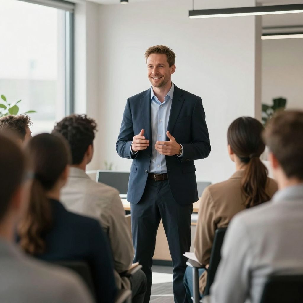 Photograph of a Caucasian man with short brown hair and a trimmed beard, wearing a dark navy blue suit, light blue shirt, and black belt, standing and smiling while giving a thumbs-up gesture. He is addressing a group of eight people, mostly with their backs to the camera, seated in a modern, well-lit office with large windows, white walls, and minimalistic decor. The audience members are dressed in business casual attire, with one woman having her hair tied in a ponytail. The background includes a potted plant and a desk with a computer.