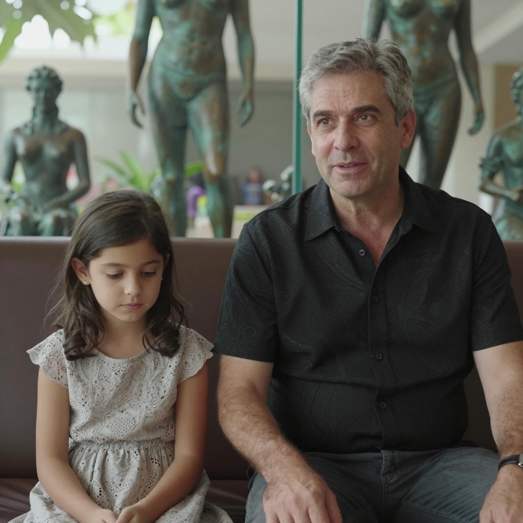 Middle-aged man with short gray hair, wearing black patterned shirt, sitting next to young girl with dark hair, wearing lace dress. Background has bronze statues and glass panels. Man looks forward with slight smile, girl looks downward. Both seated on brown leather couch. Sunlight filters through glass.