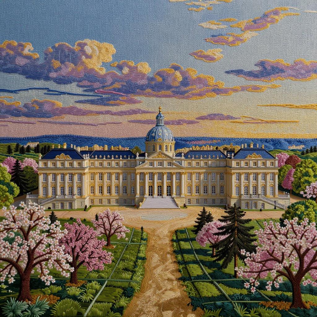 Embroidered a landscape of grand 18th century palace in the spring time during late afternoon, D&D inspired, fantasy, magical, realistic, ultra detailed, cinematic, dramatic, landscape photography, volumetric lighting,