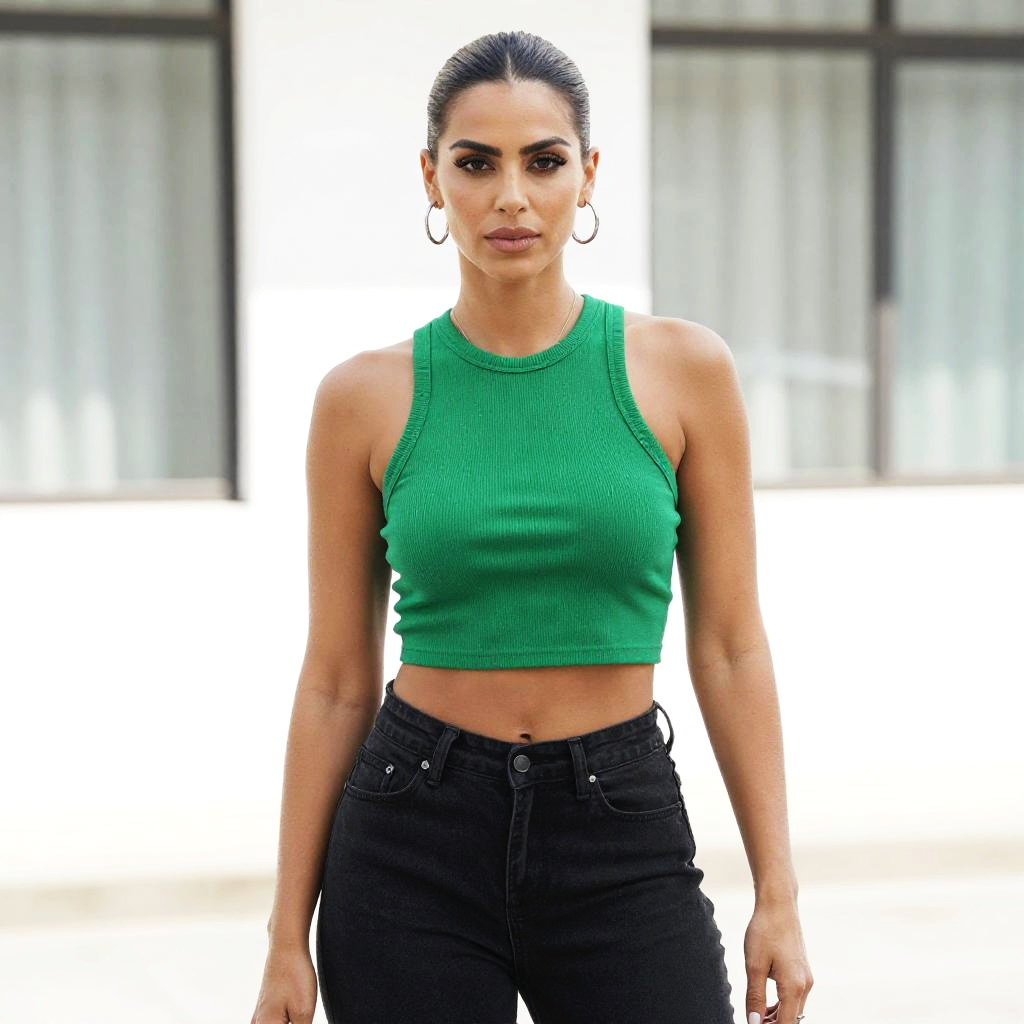 Photograph of a confident woman standing outdoors against a blurred, bright background. She has dark hair pulled back in a sleek ponytail and wears large hoop earrings. Her makeup is bold, with dark eyebrows, eyeliner, and nude lipstick. She is dressed in a vibrant green, ribbed, sleeveless crop top that highlights her toned arms and midriff, paired with high-waisted, black jeans. Her posture is straight, and she gazes directly at the camera with a serious expression. The image has a high contrast, making her the focal point against the overexposed background.