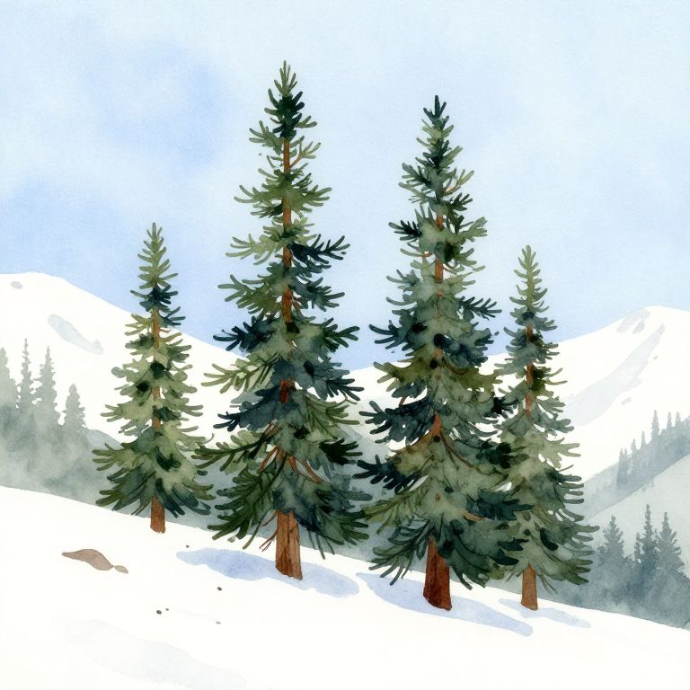 Pinos altos y delgados en un paisaje montañoso nevado, cielo azul claro y nubes suaves, estilo acuarela con trazos delicados, resaltando la textura de la corteza y el follaje verde oscuro, sensación fresca y pacífica de invierno.