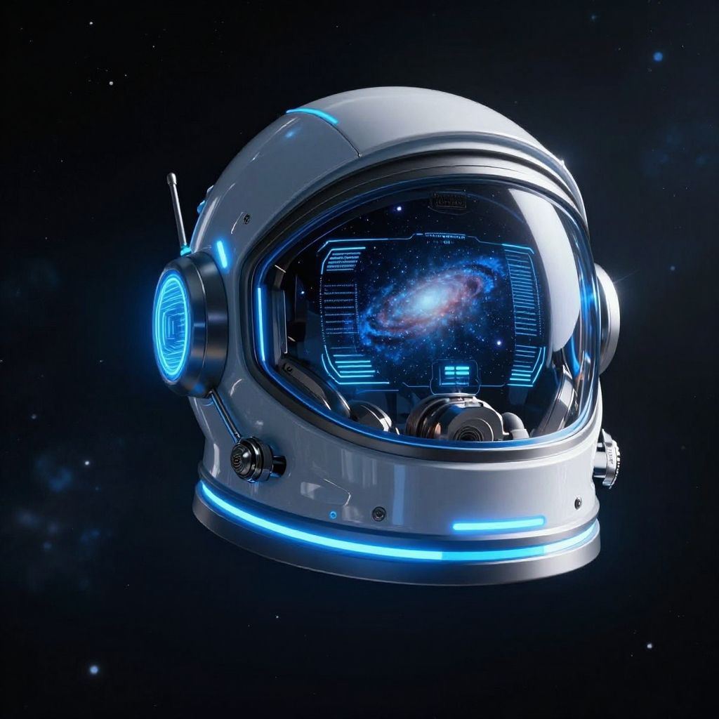 Futuristic space helmet glowing with neon blue lights, sleek metallic design reflecting distant galaxies, high-tech HUD display visible inside, floating in deep space