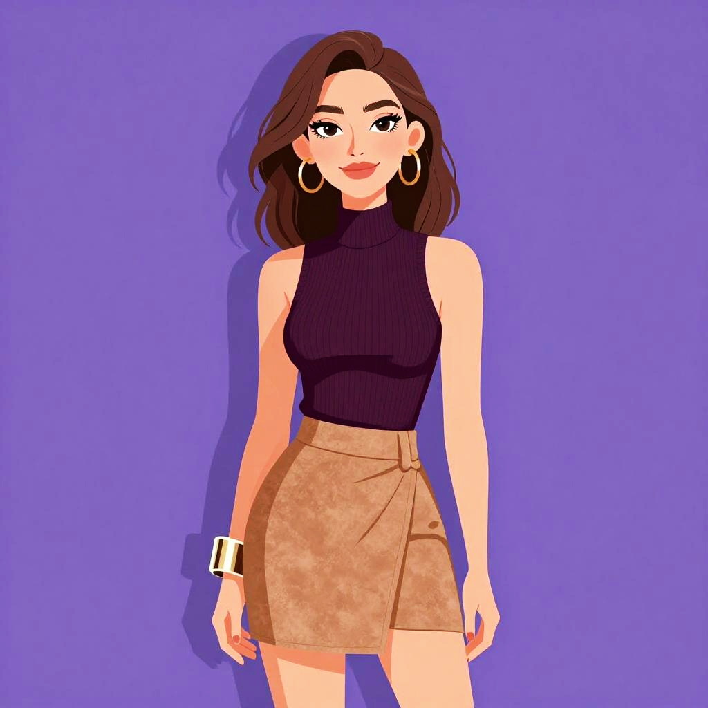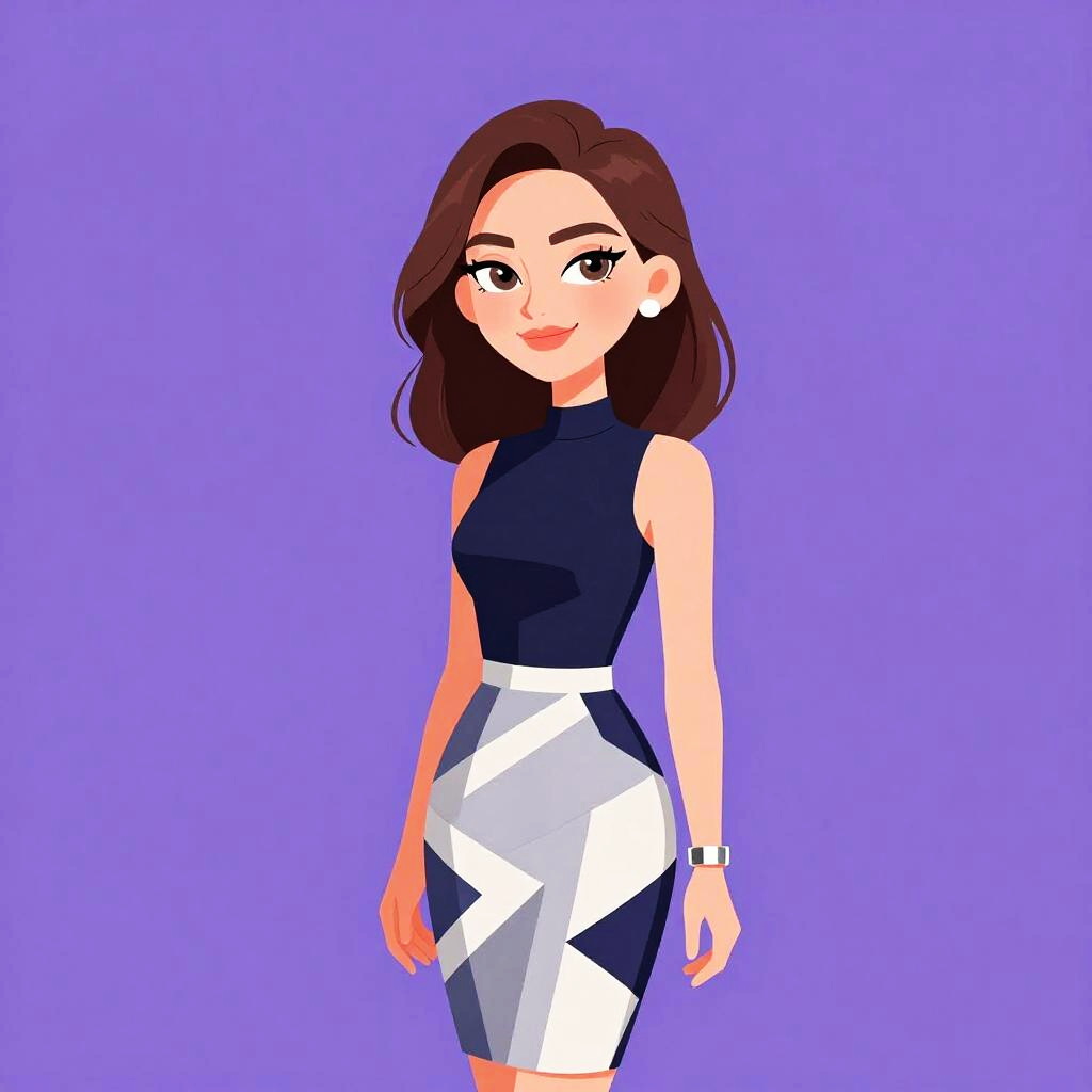 Woman with pretty face and pretty hair. smiling Woman, chic, sleeveless black top with a high neck, cut-out detail on the side, knee-length skirt with geometric patterns in gray, blue, and white, silver cuff bracelet on one wrist. --sref 1467