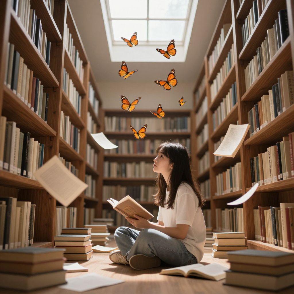 A serene library scene unfolds as a young woman sits cross-legged among scattered books, engrossed in reading, while six vibrant orange butterflies gracefully ascend toward the skylight, surrounded by floating book pages and illuminated by soft natural light filtering through the towering wooden shelves.