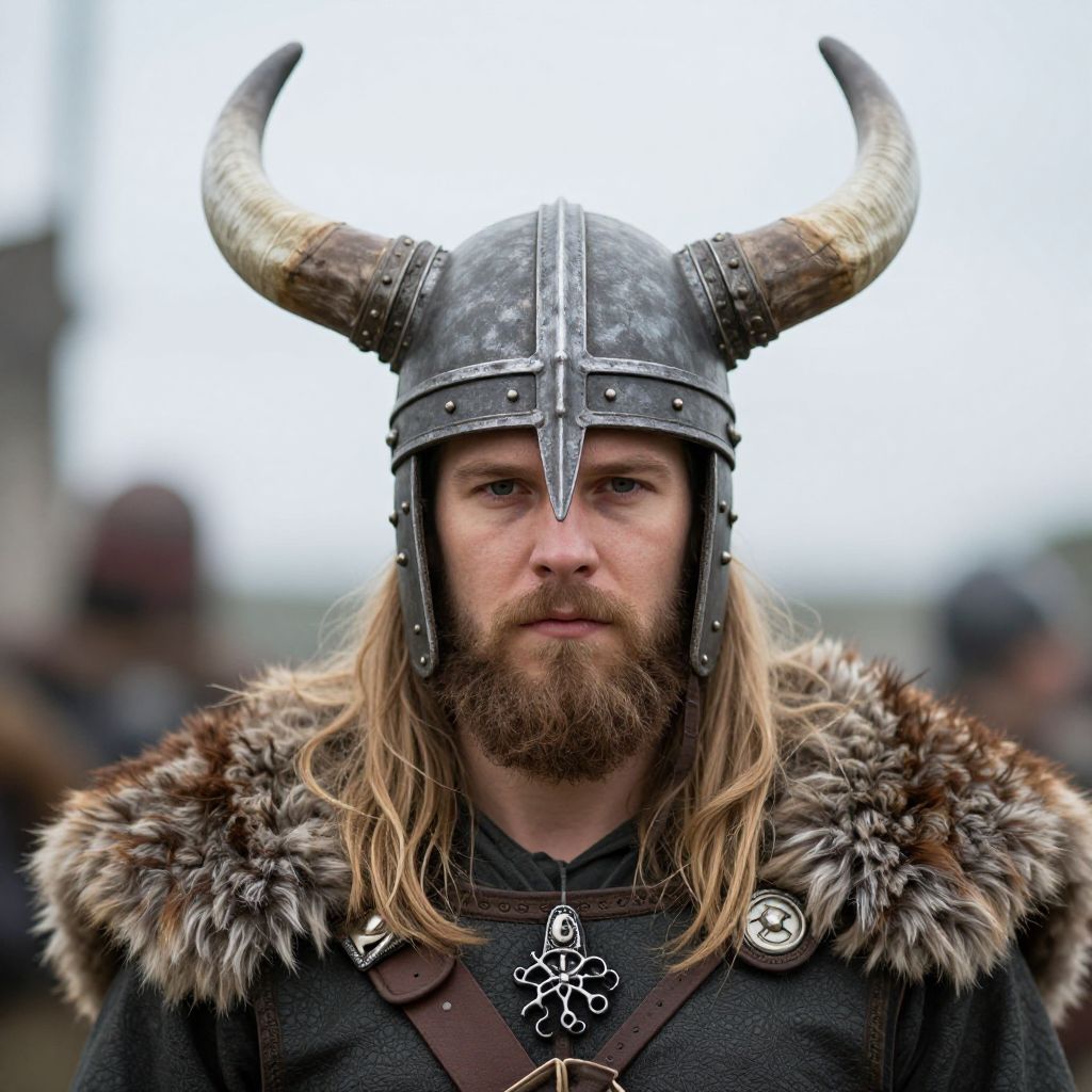 Adult viking costume male, 1boy, male focus, horns, solo, beard, facial hair, fake horns, long hair, blonde hair, looking at viewer, horned helmet, blurry background, blurry, outdoors, helmet, fur trim