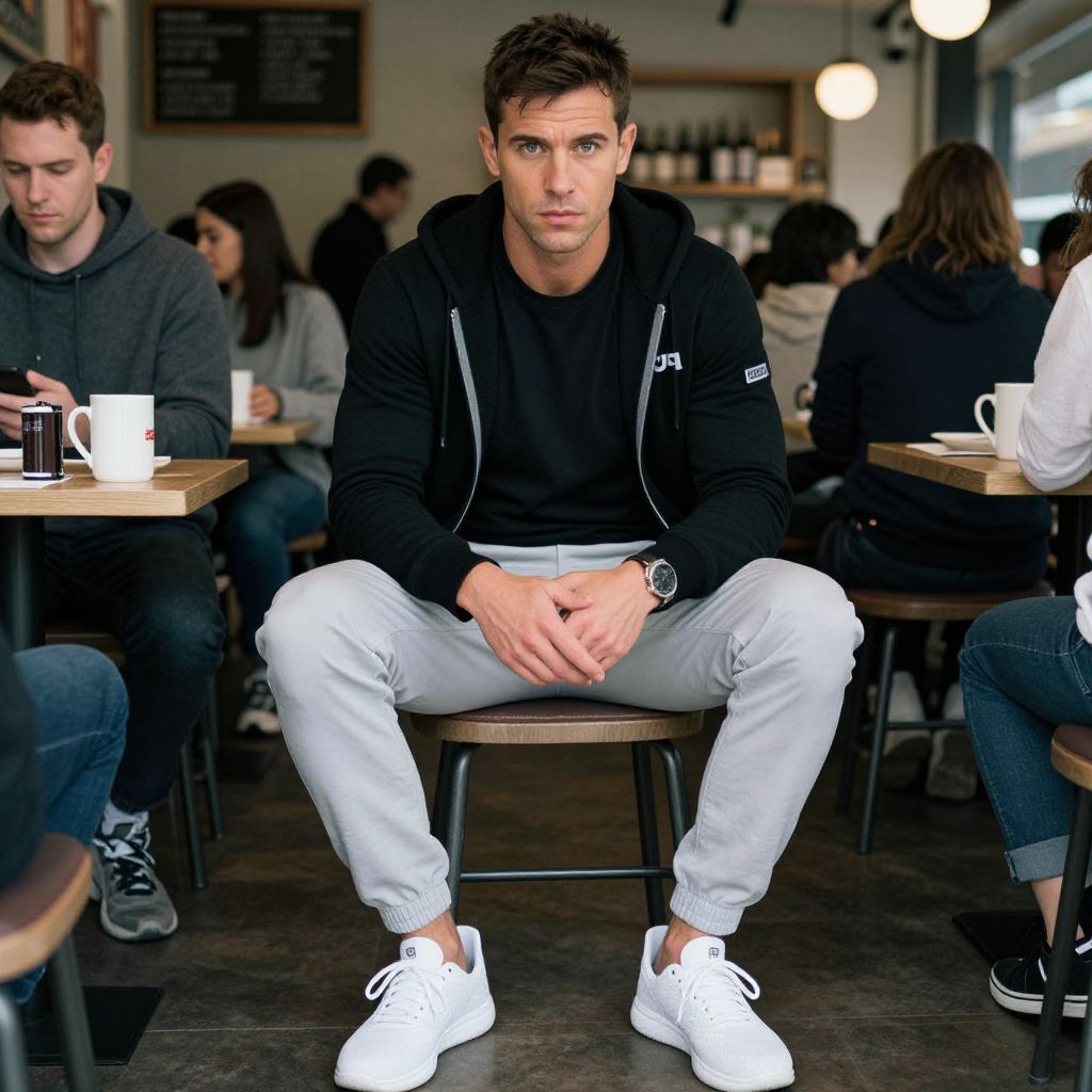 A man, slim-fit black t-shirt, lightweight gray joggers, breathable white sneakers, sleek black zip-up hoodie, reflective details, bustling cafes, 3M analog film stock, focused expression, vibrant atmosphere.Man has masculine face and piercing eyes