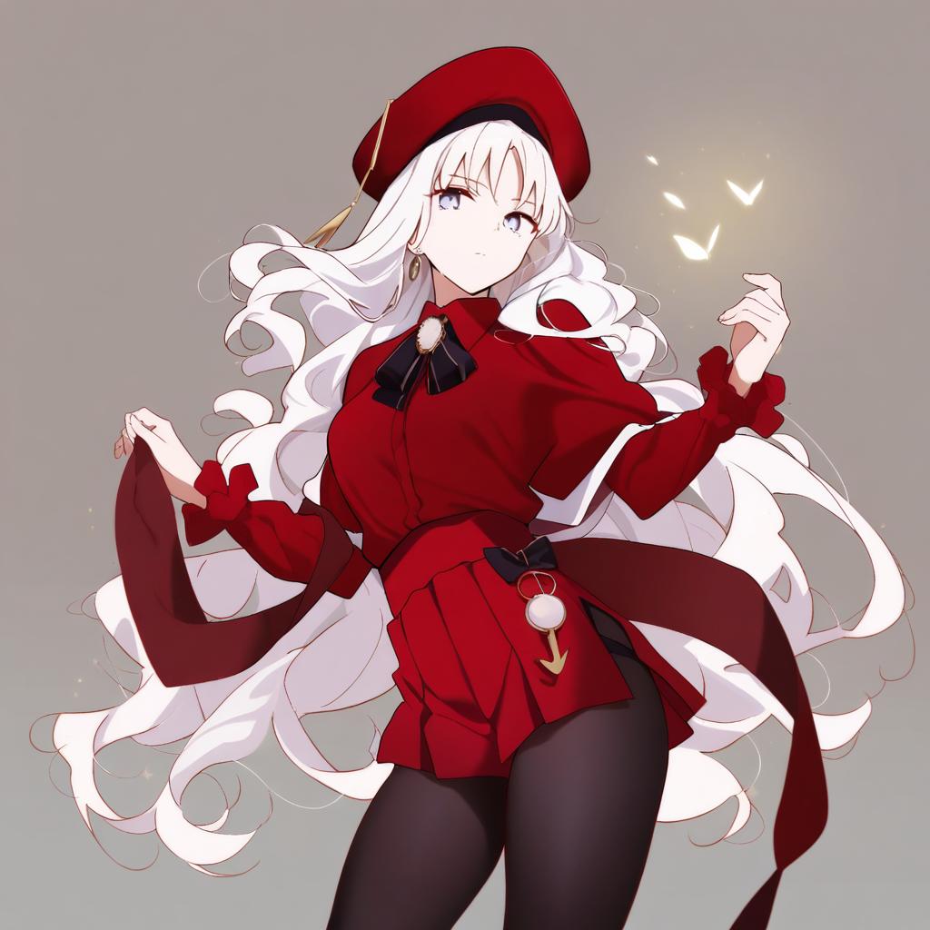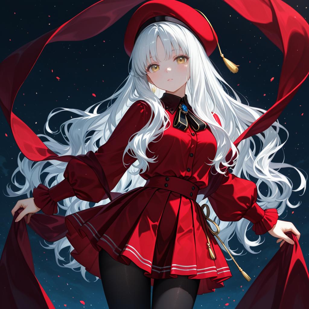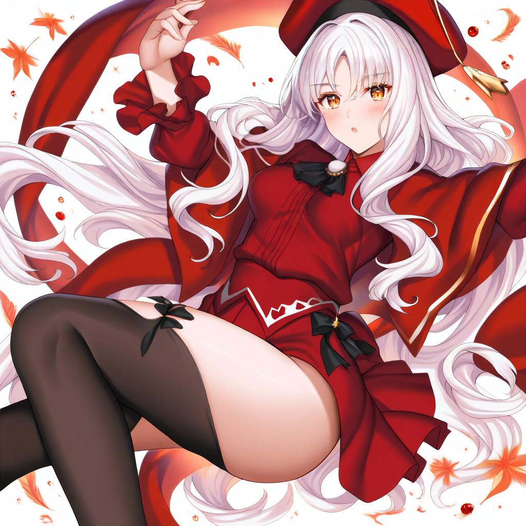 Caren hortensia (amor caren), fate (series), 1girl, yellow eyes, white hair, wavy hair, long hair, very long hair, medium breasts, thighs, red headwear, red dress, black pantyhose, long sleeves, neck ribbon, beret, brooch, shawl, by artist tem10, anime