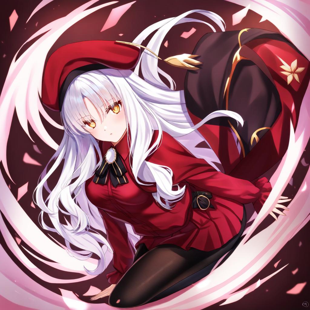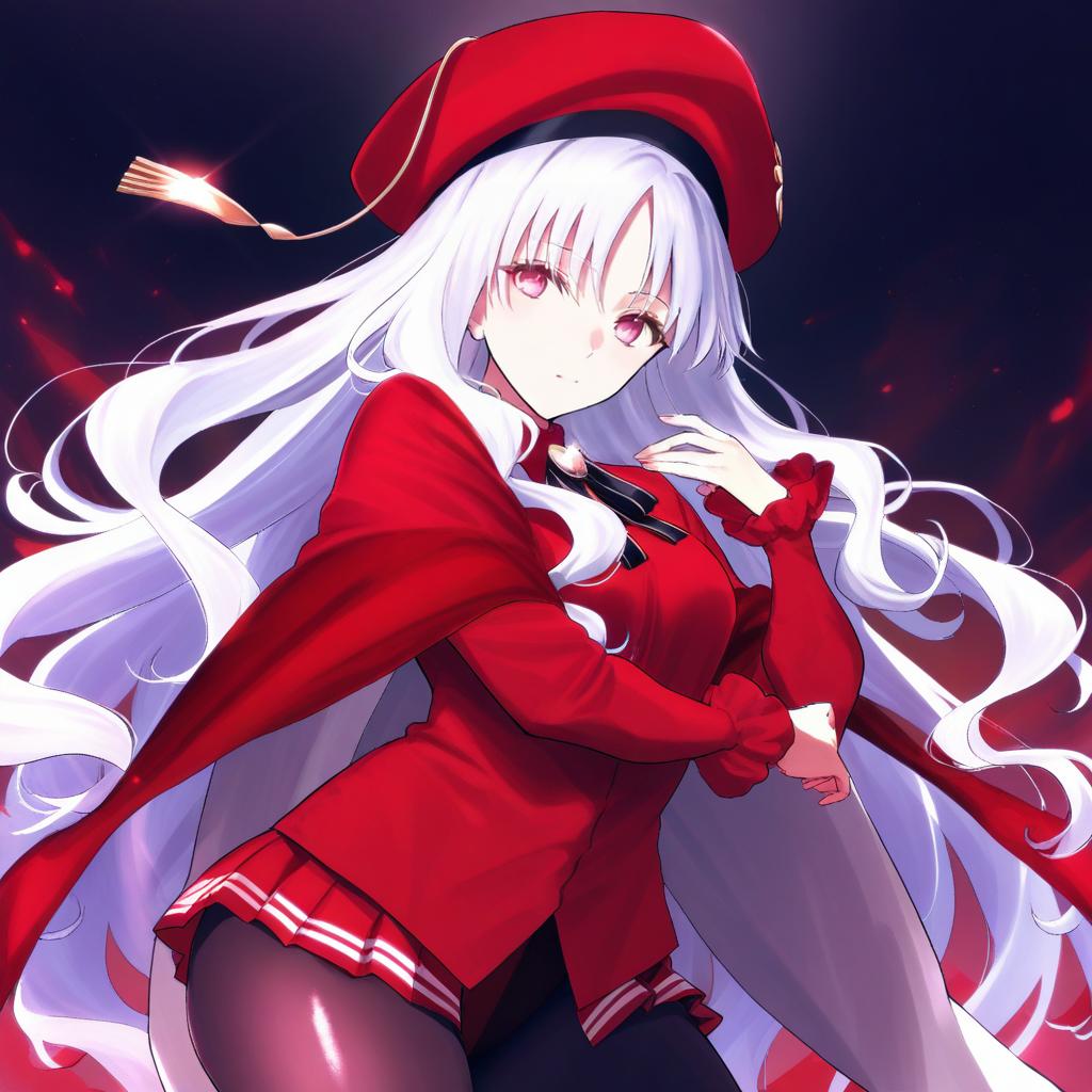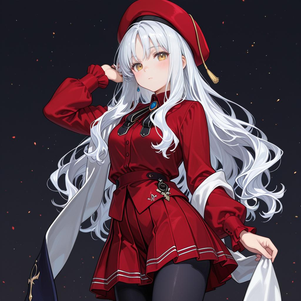 Caren hortensia (amor caren), fate (series), 1girl, yellow eyes, white hair, wavy hair, long hair, very long hair, medium breasts, thighs, red headwear, red dress, black pantyhose, long sleeves, neck ribbon, beret, brooch, shawl, by artist tem10, anime