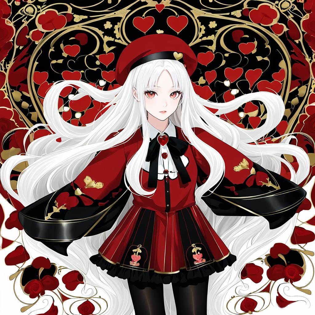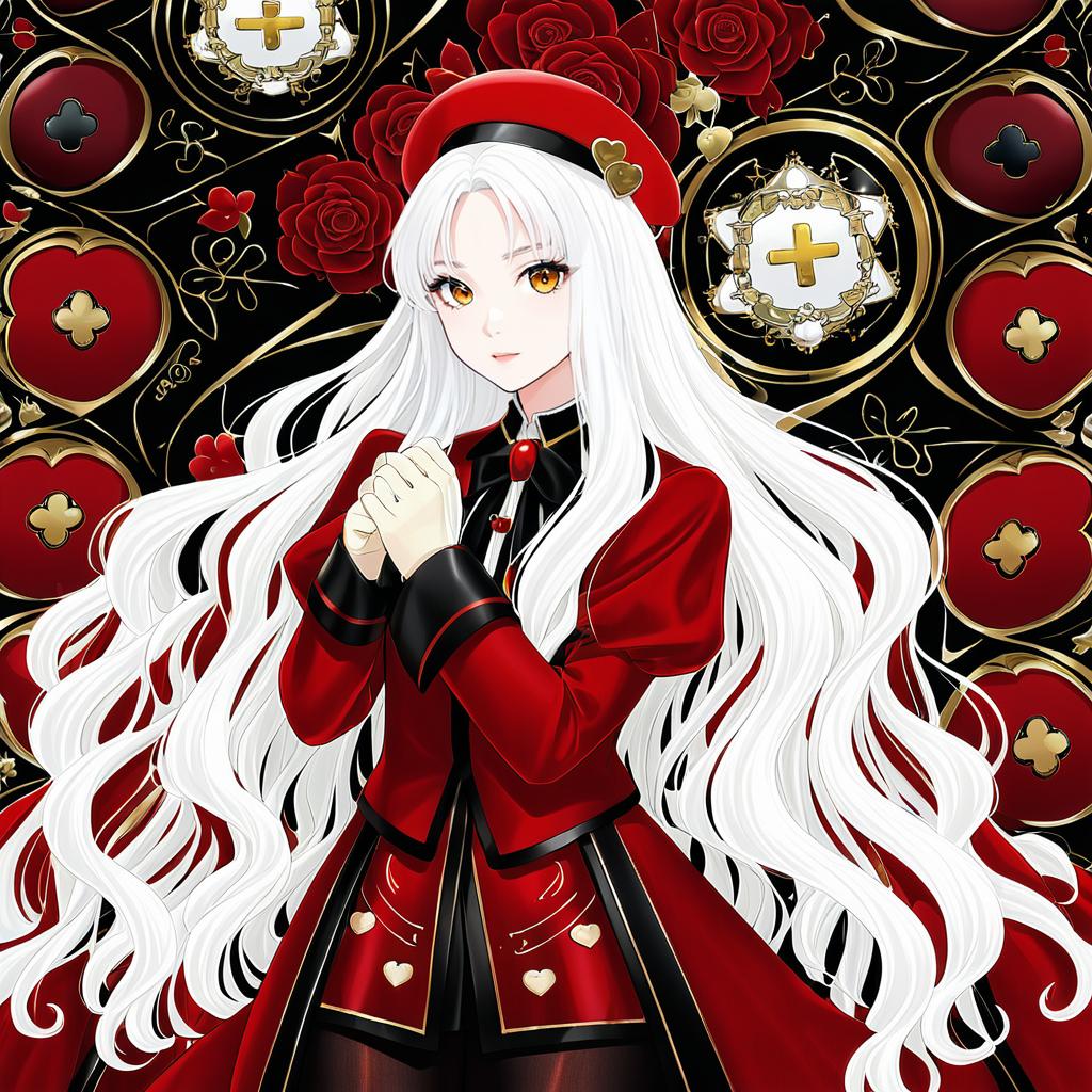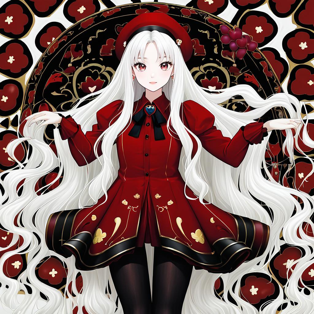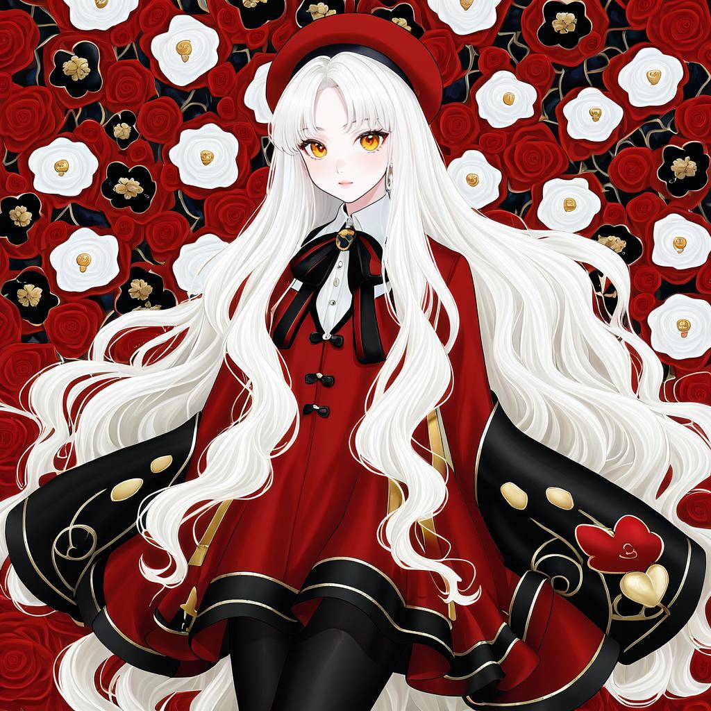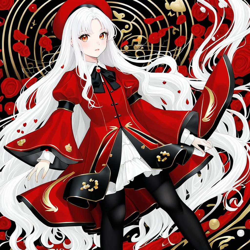 Anime-style illustration of a young female character with very long white wavy hair and yellow eyes. She wears a vibrant red dress with gold and black detailing, long bell sleeves, a black neck ribbon with a red brooch, black pantyhose, and a matching red beret. The background features swirling gold music notes and red roses, enhancing the elegant and mystical vibe of the scene.